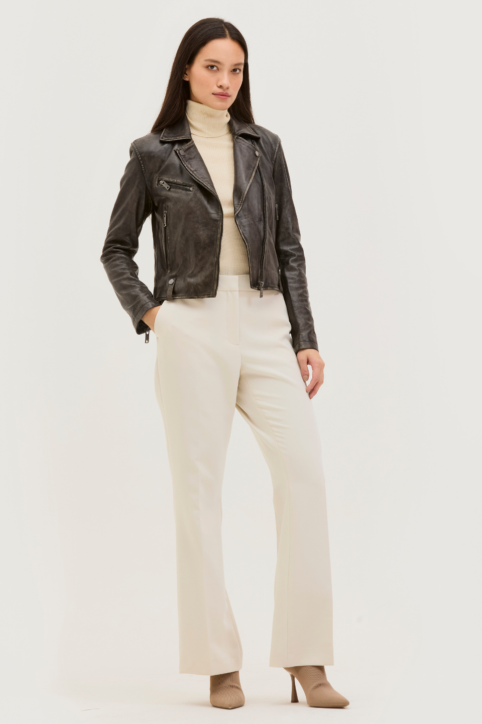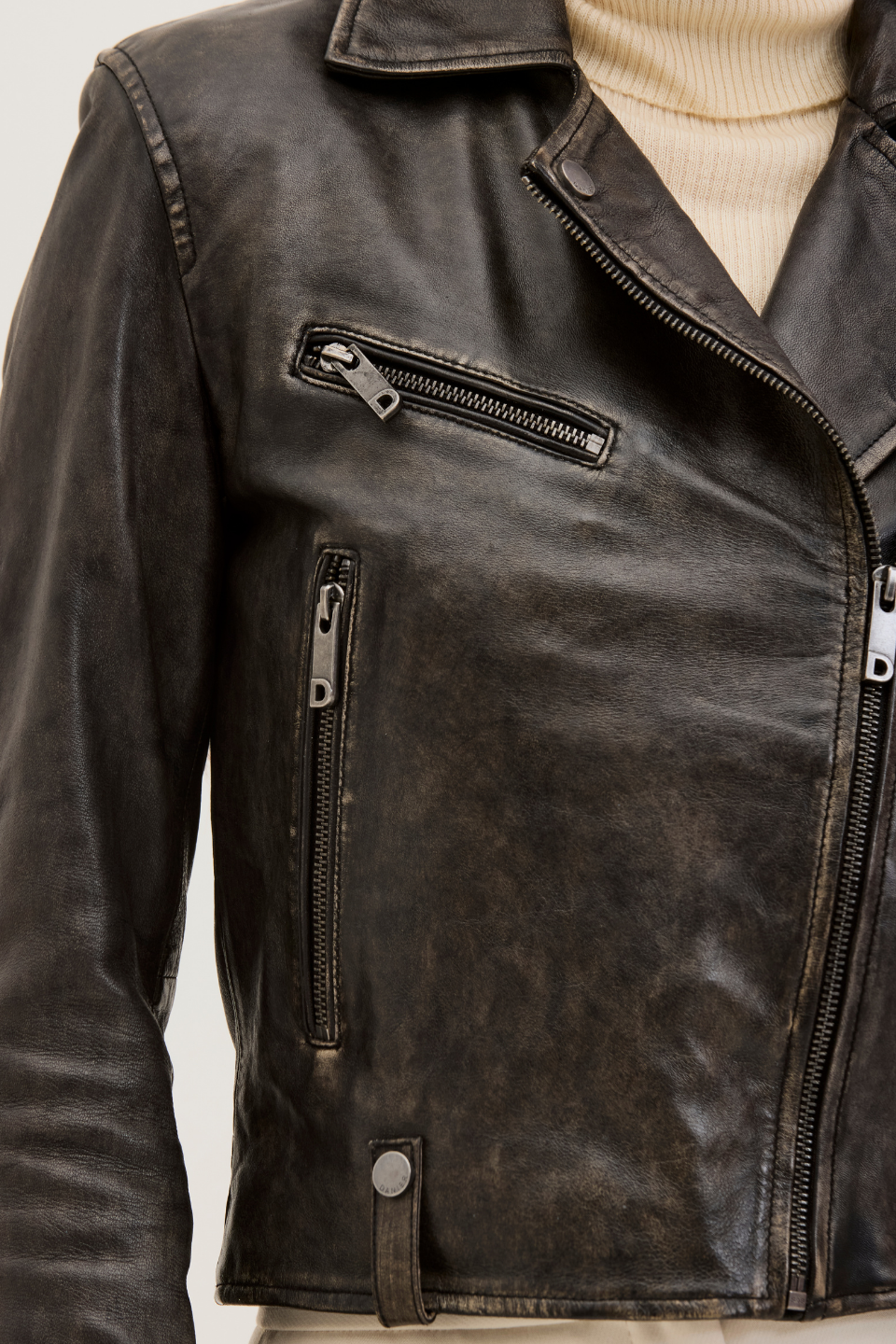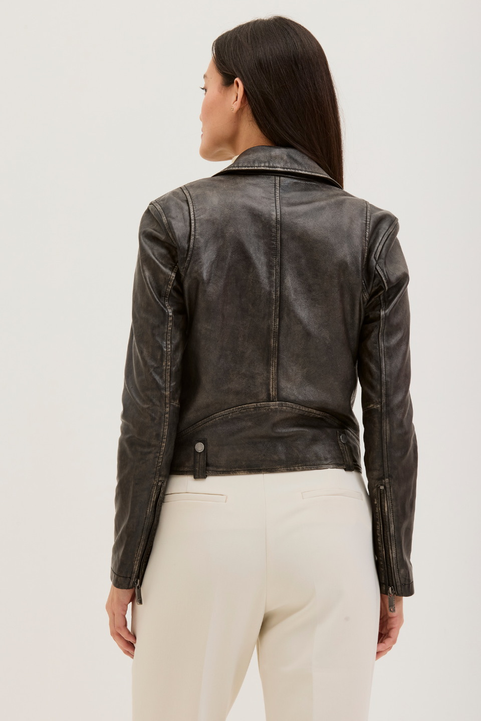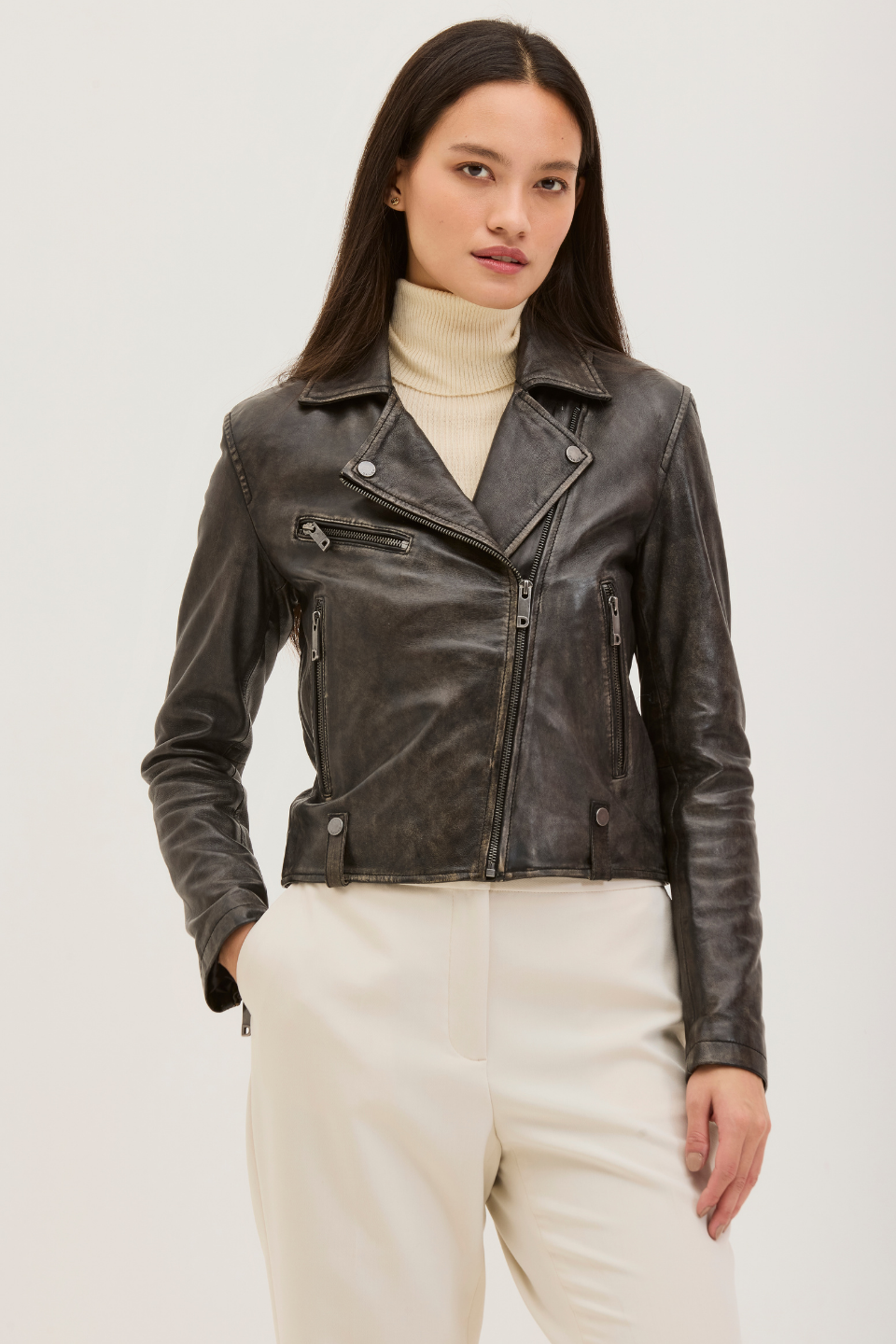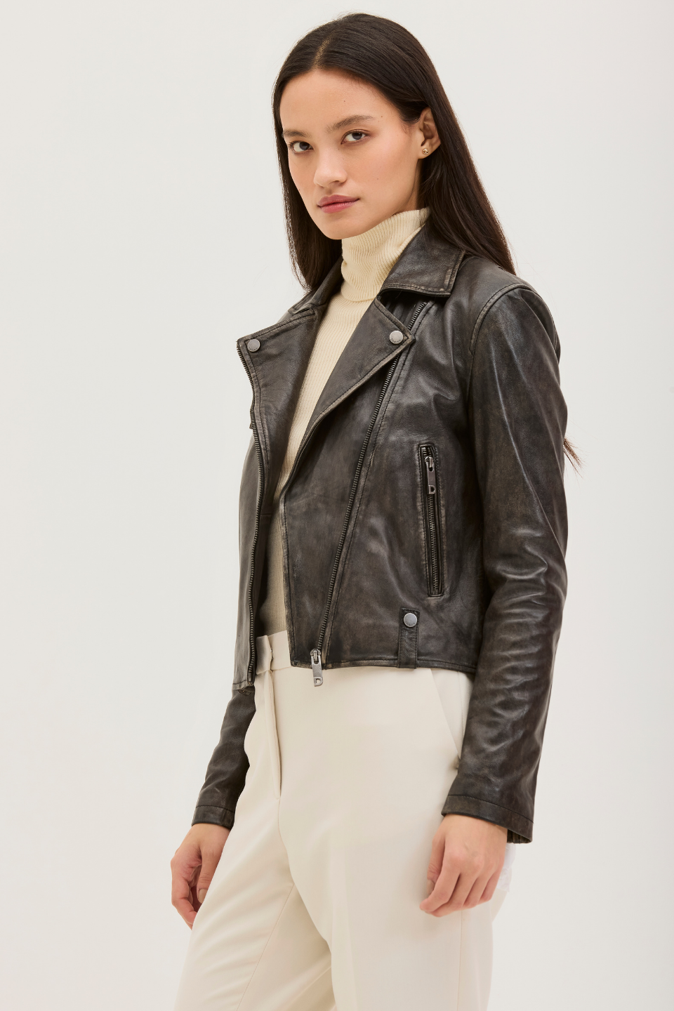 Our biker jacket, VALE, is modeled on classic biker styles. Constructed in Lamb Leather and fully lined, it is fitted with zippered pockets, snaps, a notch collar, and zipped cuffs. The leather has a worn look that makes the style look more edgy and cool. VALE’s cropped hem looks especially cool with high-rise pants.