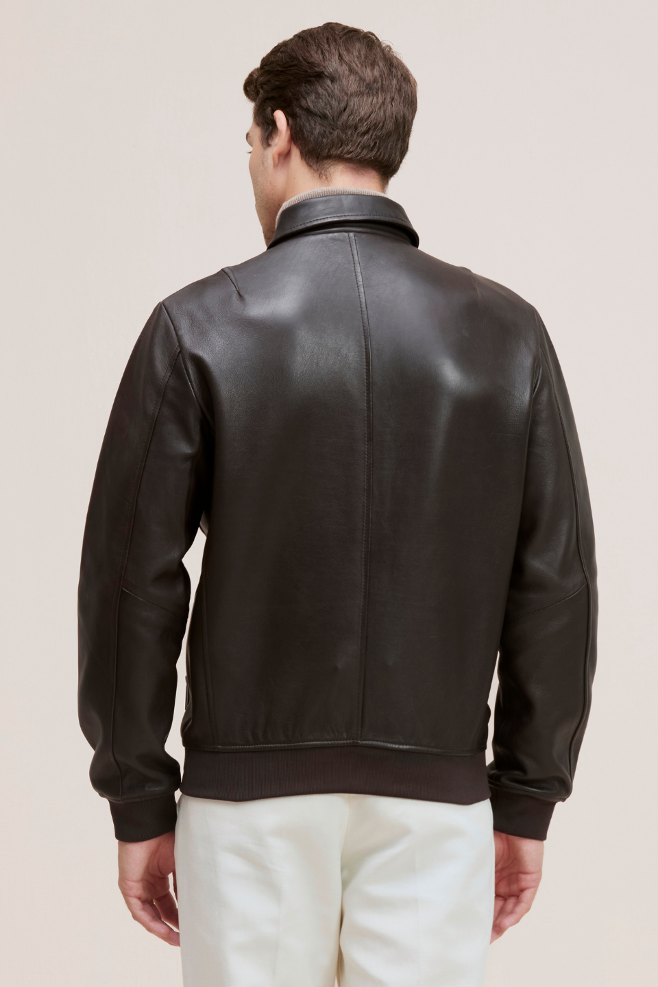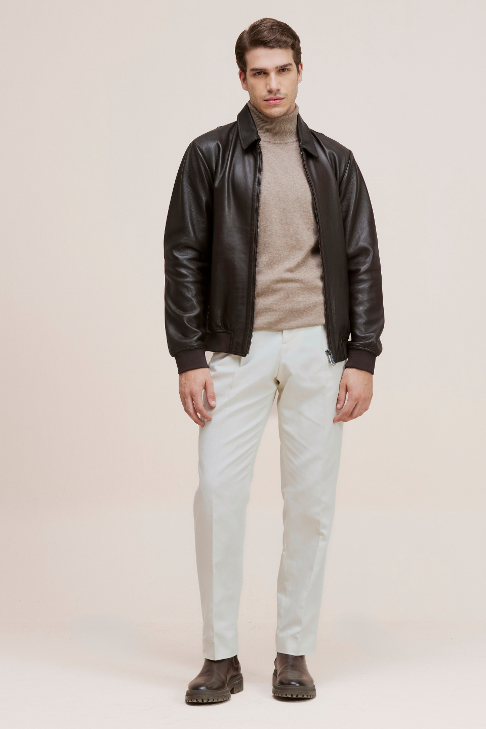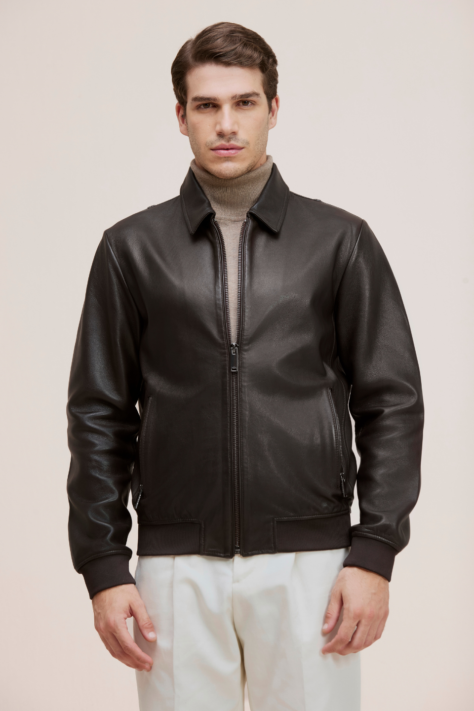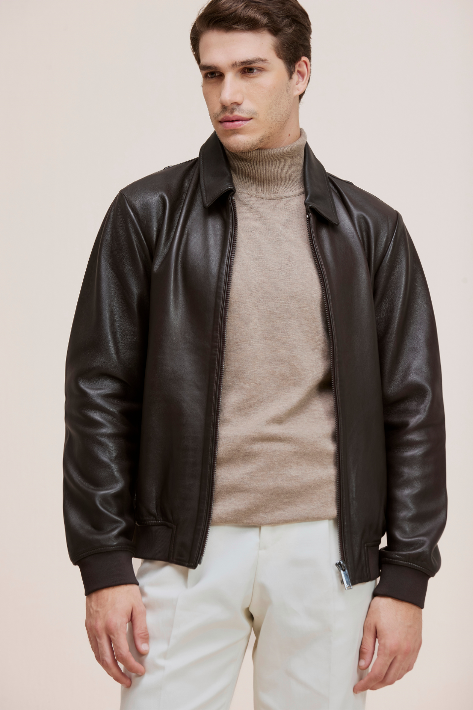 When transitional weather calls for light layering, our TURNER leather bomber jacket is the ideal choice.  Cut from our softest lamb leather and bonded to a imported Italian knit lining, this style is lightweight, yet structured enough to give a tailored look.  Key elements include a classic shirt collar, zip front closure, zippered pockets, with knit cuff and waist-band.  An ideal jacket option for work or weekends.
