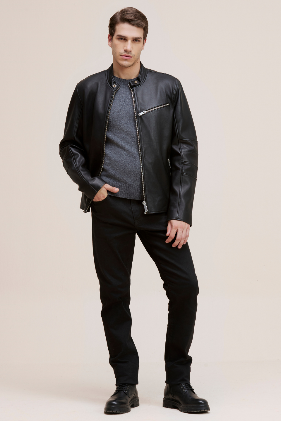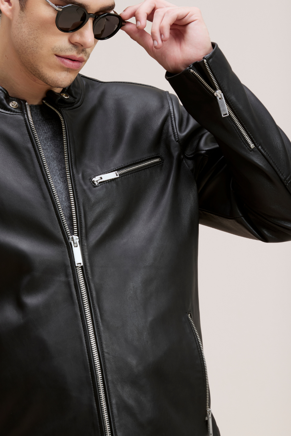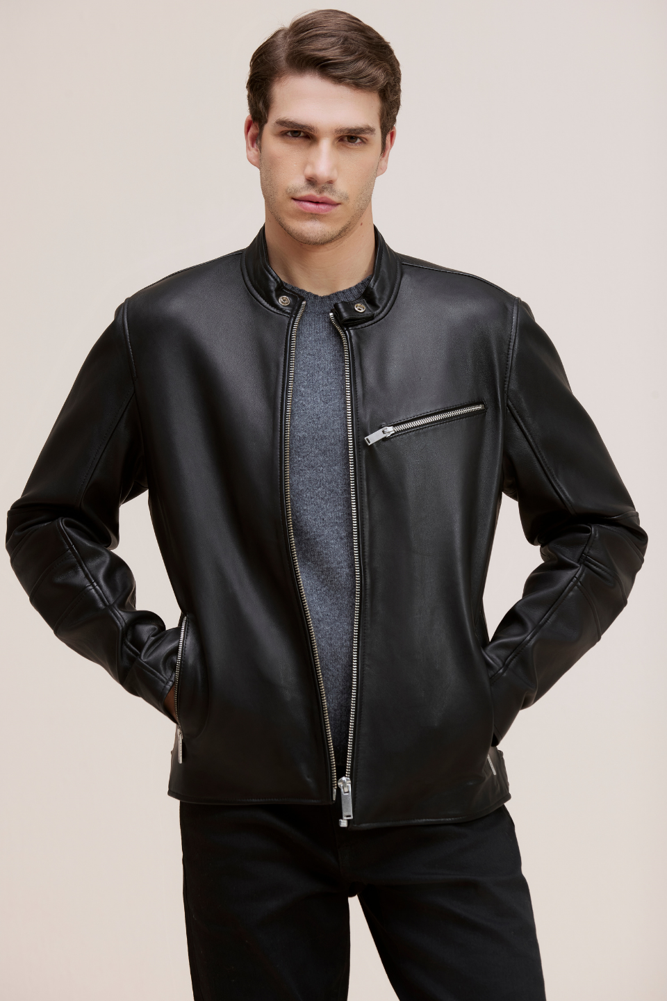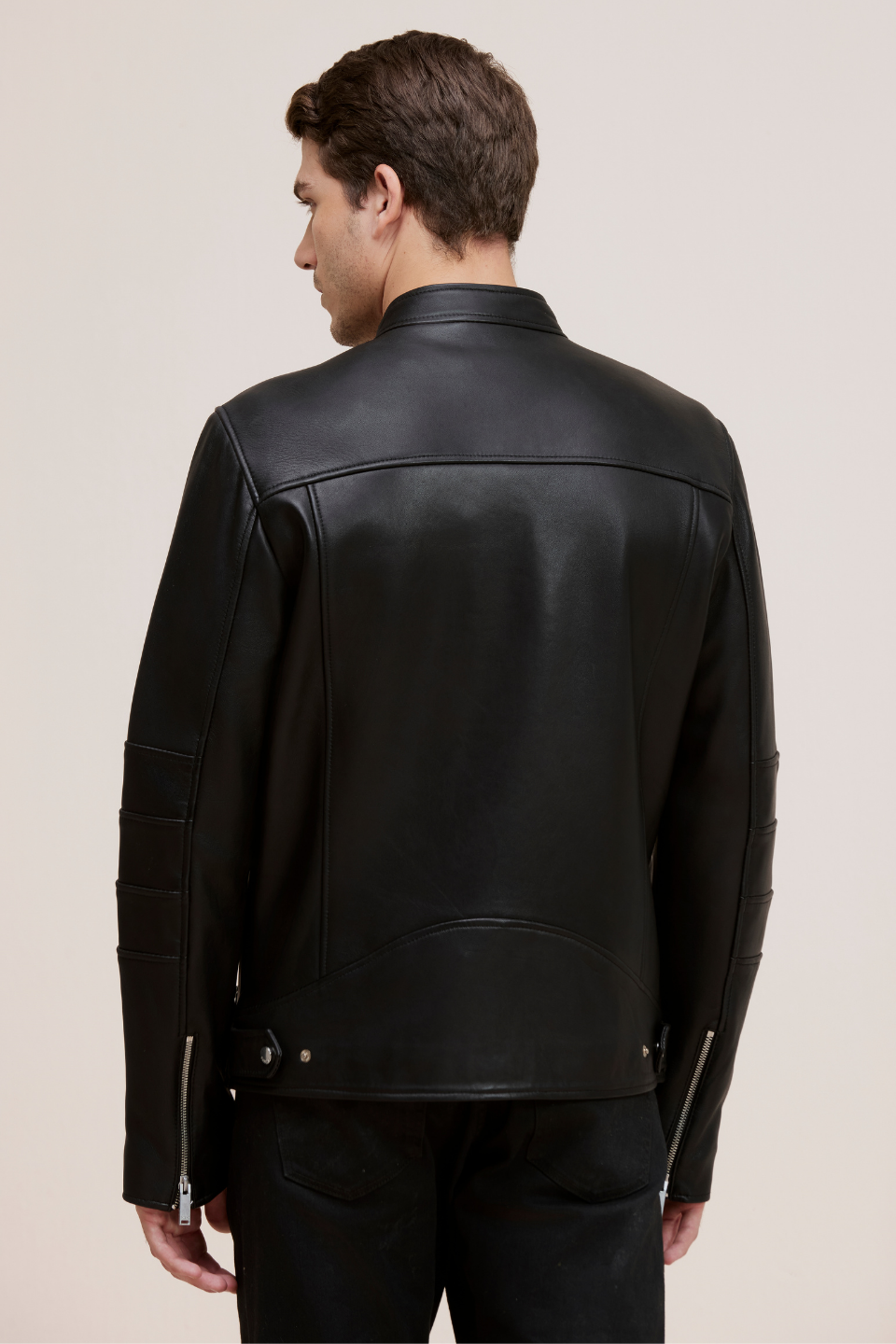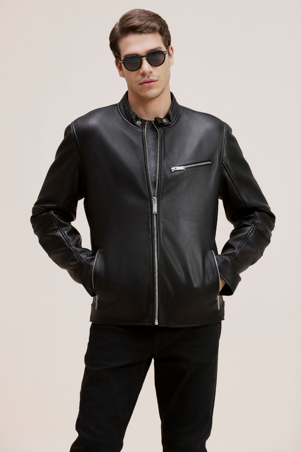 Borrowing elements from the classic racer jacket, CORBAN offers a streamlined version of the look that’s perfectly suited to your casual lifestyle. Crafted in our signature smooth genuine lamb leather, this bomber jacket style features a slim fit, paneled elbow detailing, zipper closures on front, pockets and sleeves and banded collar with snap-fastening tab. Silver-toned metal hardware adds the right accent. Clean, sporty and thoroughly modern, this is an investment piece that’ll only get better with age. Fully lined.