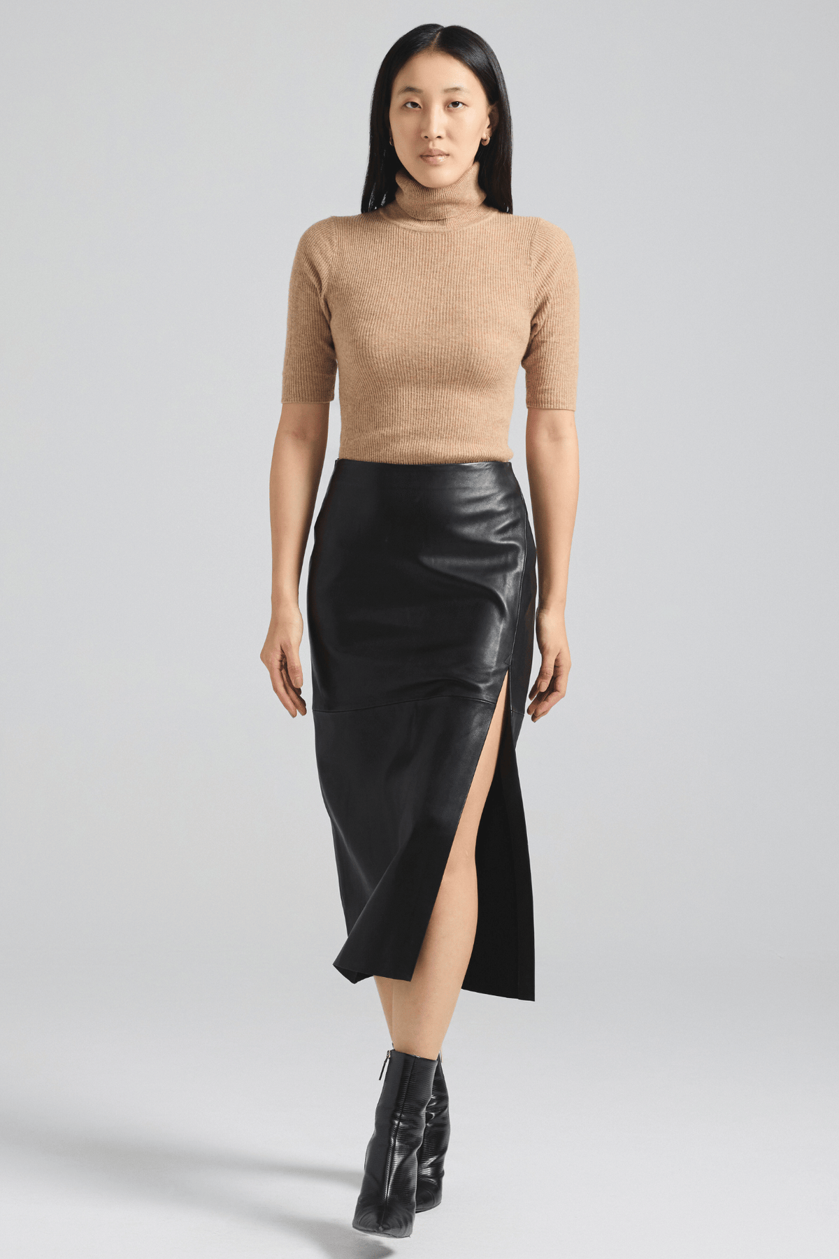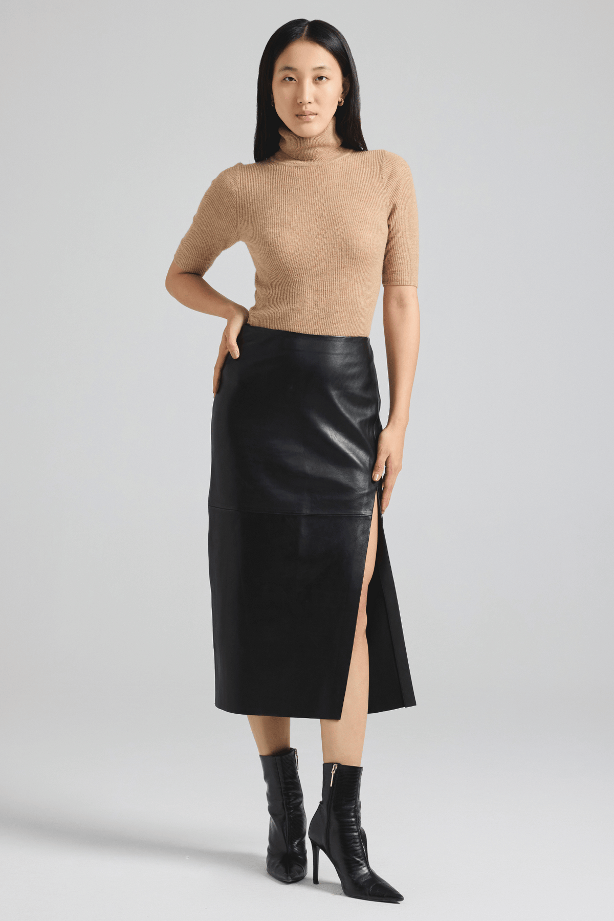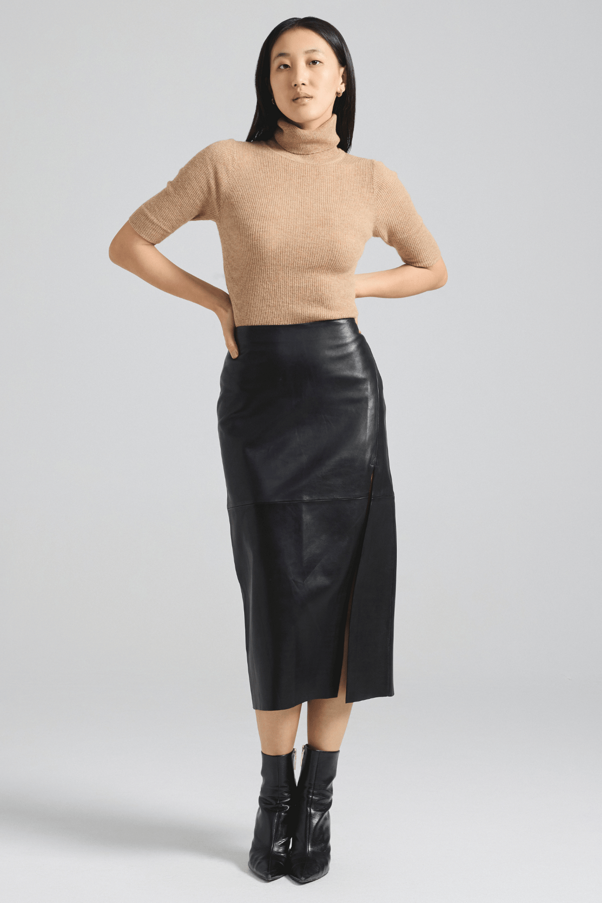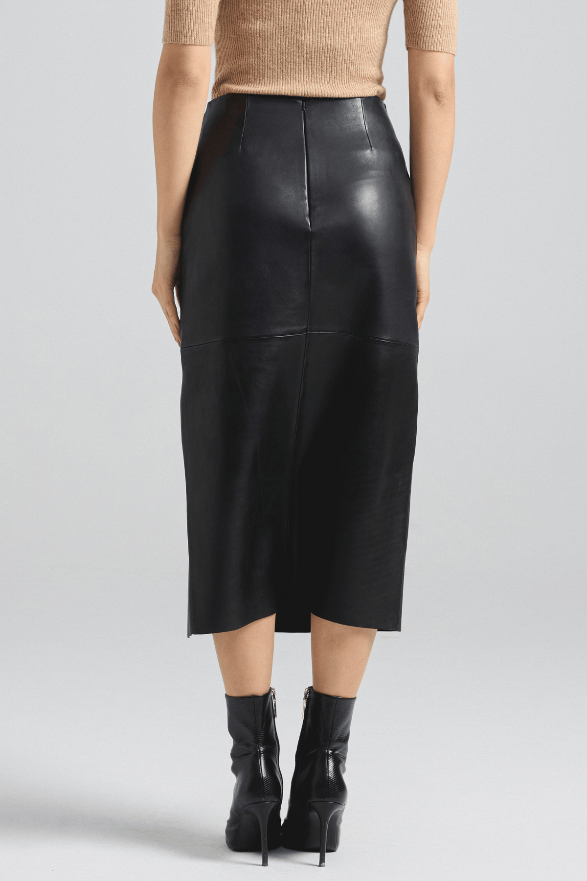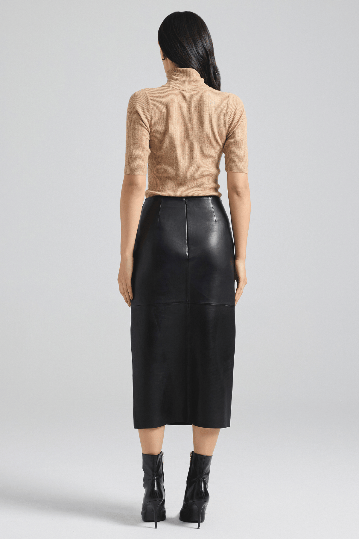 CRESSIDA is a high-waisted midi skirt in supple lamb leather. Designed with a front thigh slit, back seam detailing, and concealed zip closure, it combines movement with structure. Fully lined for comfort. Feminine with just enough edge.