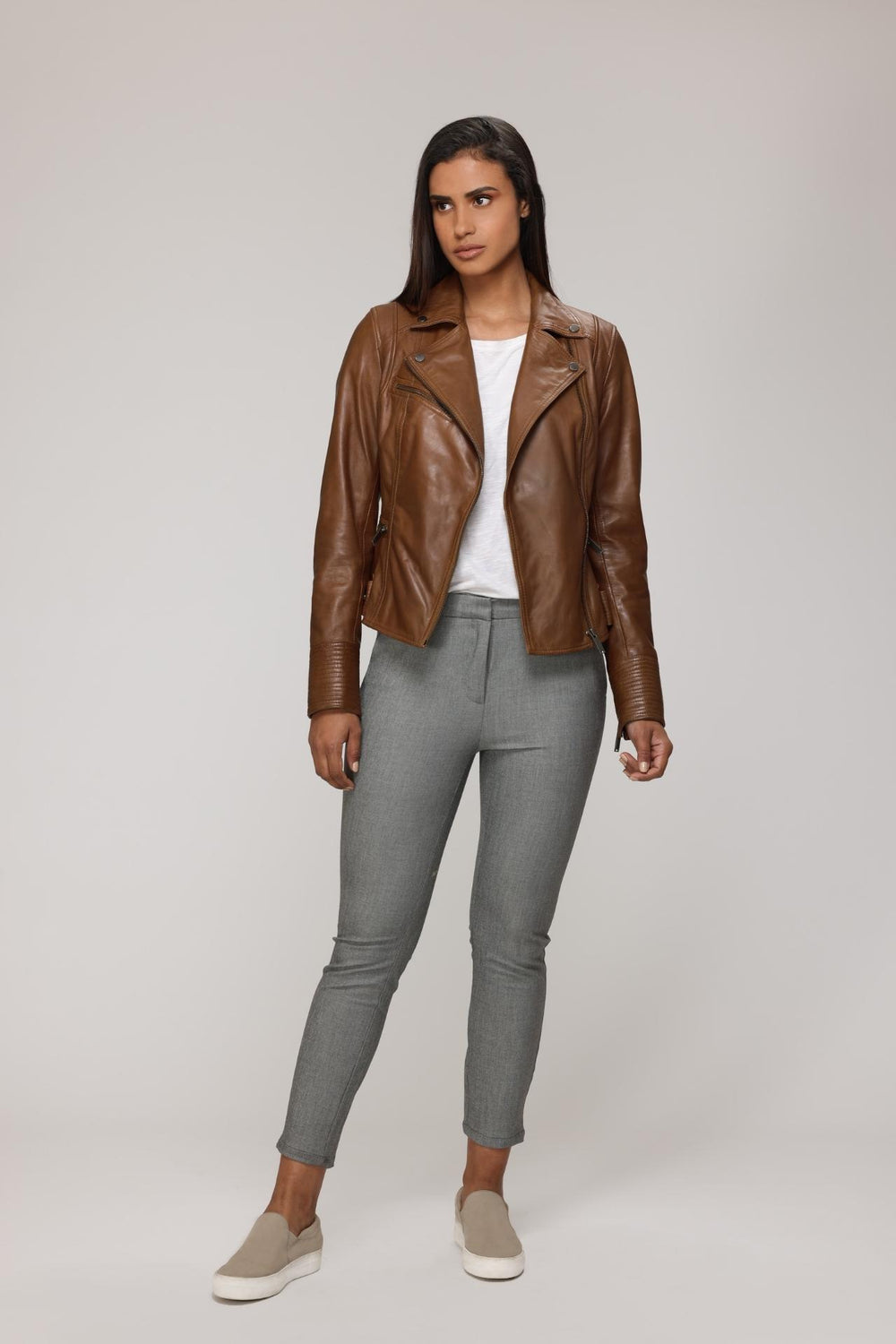 Our new TATIANA is the ultimate biker jacket. Expertly cut in supple lambskin leather, it features gunmetal tone hardware, quilted sleeve and back panels and zippered sleeve expansion for added versatility. Its slim fit and fiery red colour makes this a day-to-night statement piece.