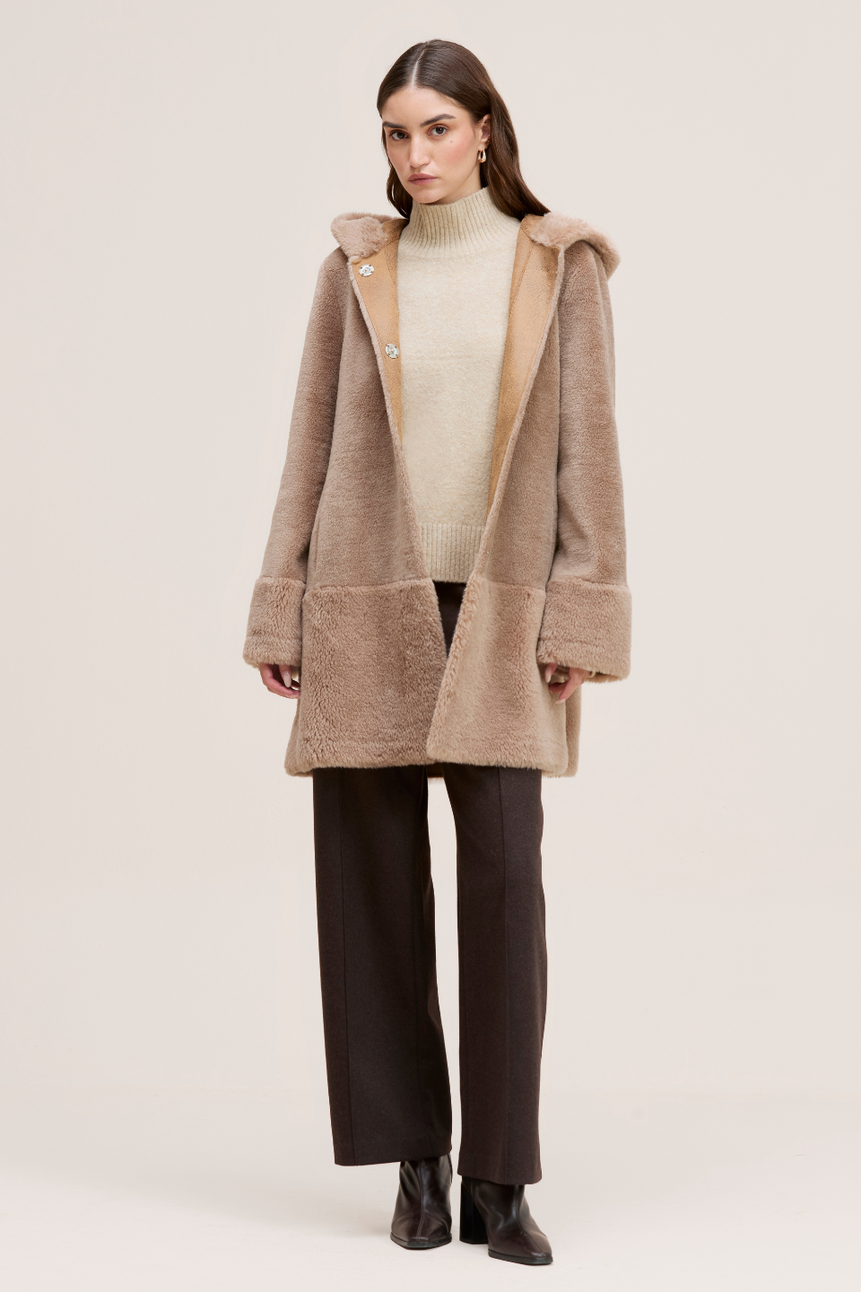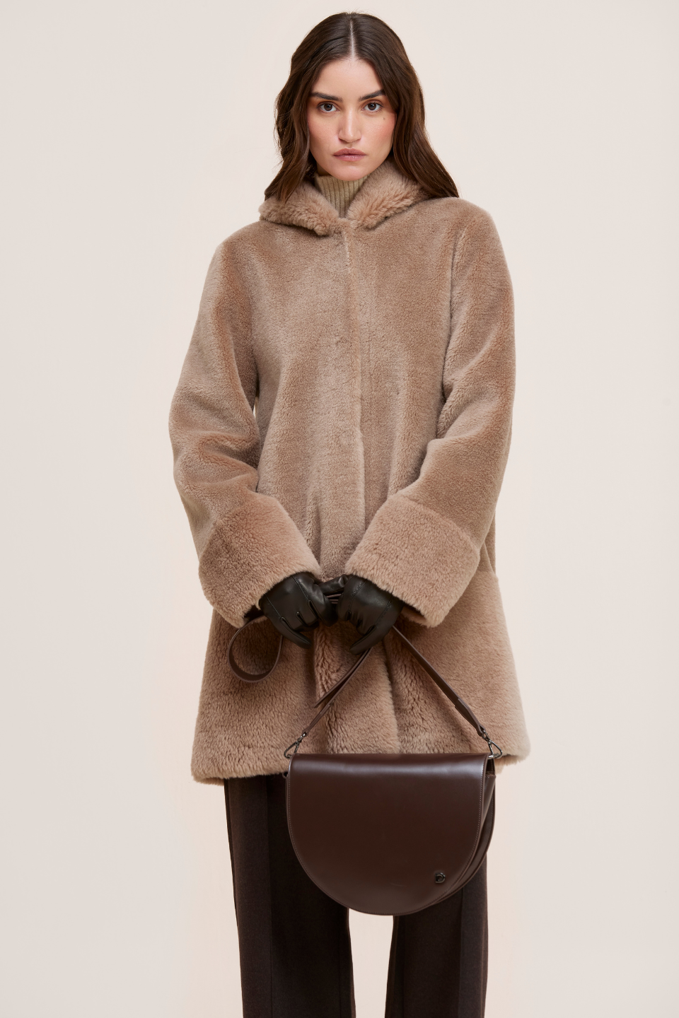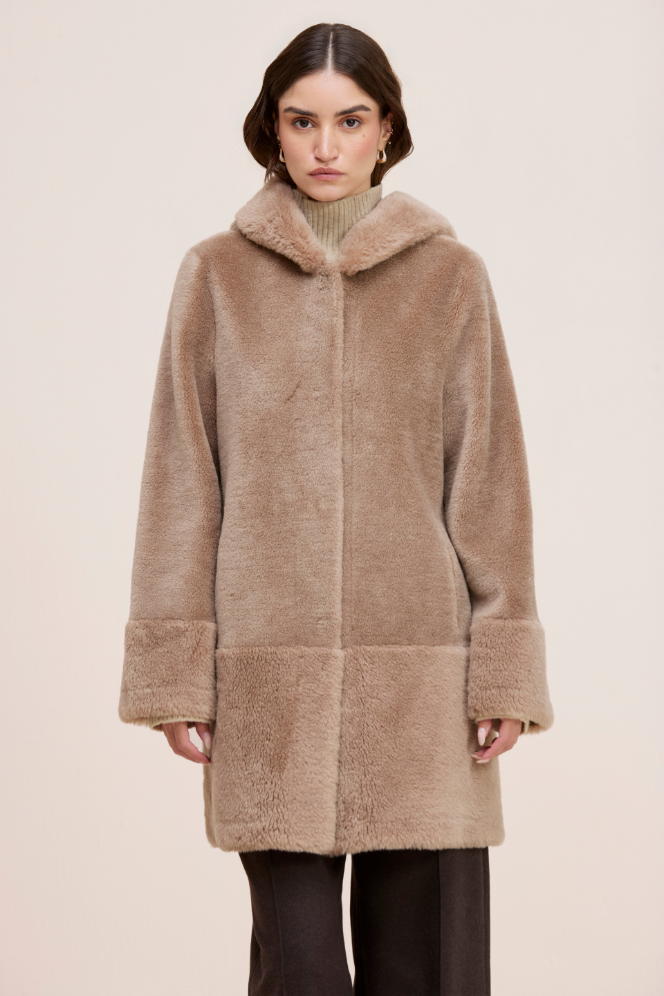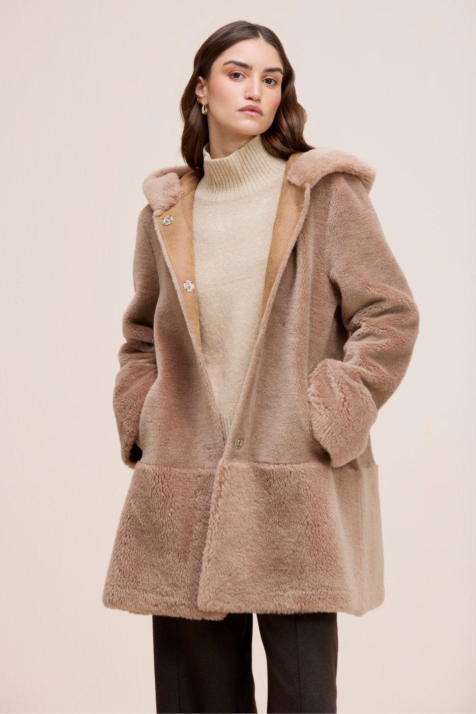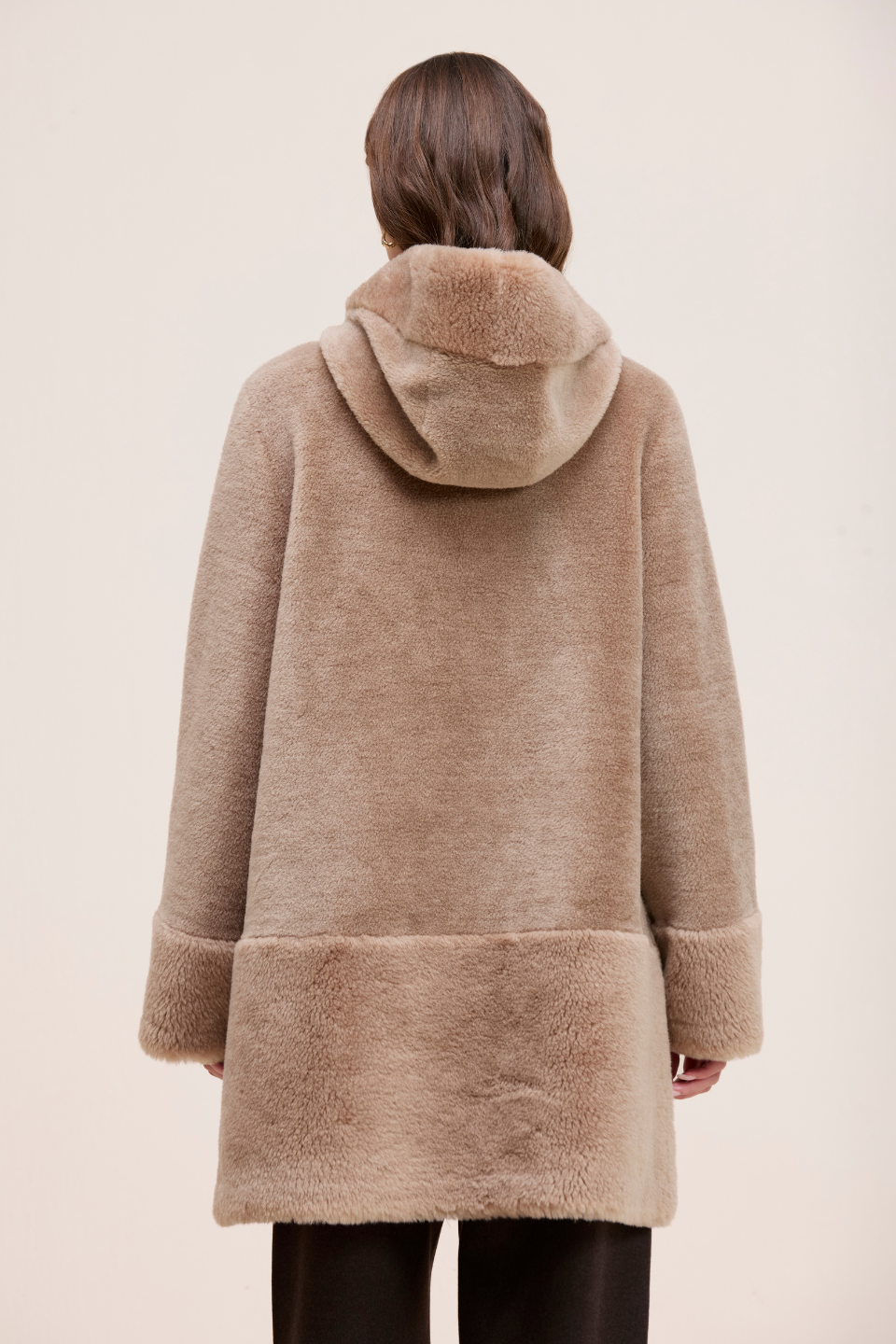 ANNIKA, our new mid-length wool coat made from luxuriously soft sherpa pure wool. Designed for a relaxed fit, it features a cozy hood, snap front closure, and slit pockets, all accented with longer sherpa hair detailing along the body, sleeves, and hood hem. The high-quality ANNIKA coat effortlessly elevates any outfit, allowing you to dress it up for a sophisticated look or dress it down for a charming, casual vibe.