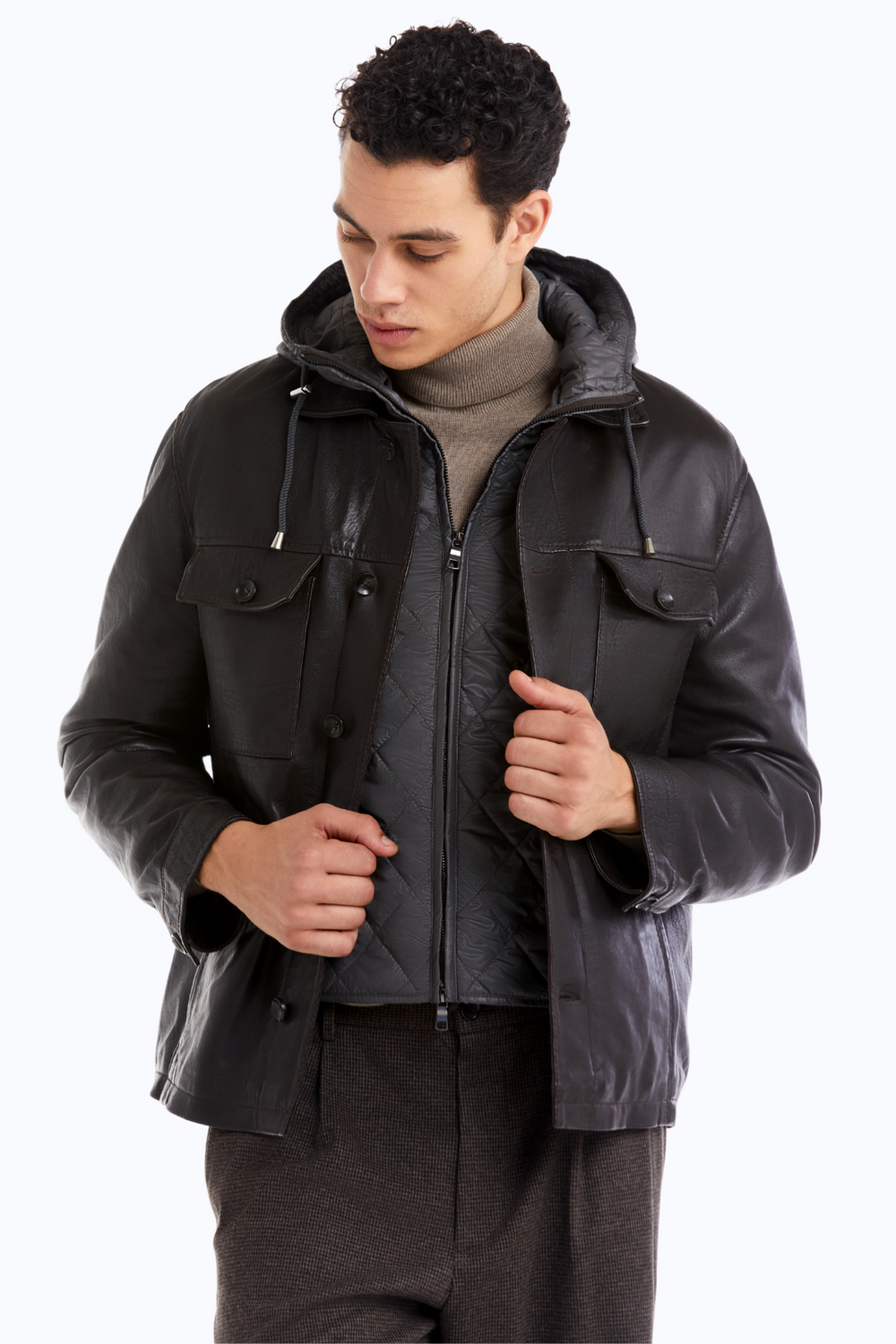 Meet BECKETT, your go-to for elevated outerwear with a masculine edge. Crafted from genuine lamb leather and fully lined in Wool for all-day comfort and warmth, this jacket features chest patch pockets, a clean front closure, and a removable hooded vest layer for versatile warmth and style. BECKETT balances form and function effortlessly. Layer it over tailored looks or casual fits; BECKETT delivers style with substance.