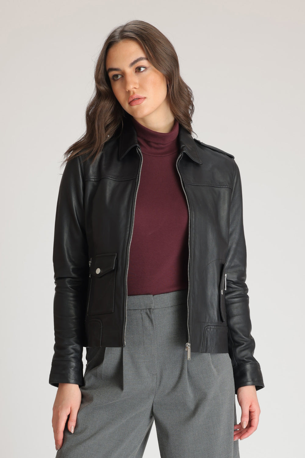 PHYLLA our black leather zip-up jacket is a short, semi boxy fit. It's made in our iconic buttery soft lamb leather and is finished with all the signature details you would expect, including epaulets, and zippered waist pockets. The jacket works so well with high-waisted jeans or over a fitted dress.