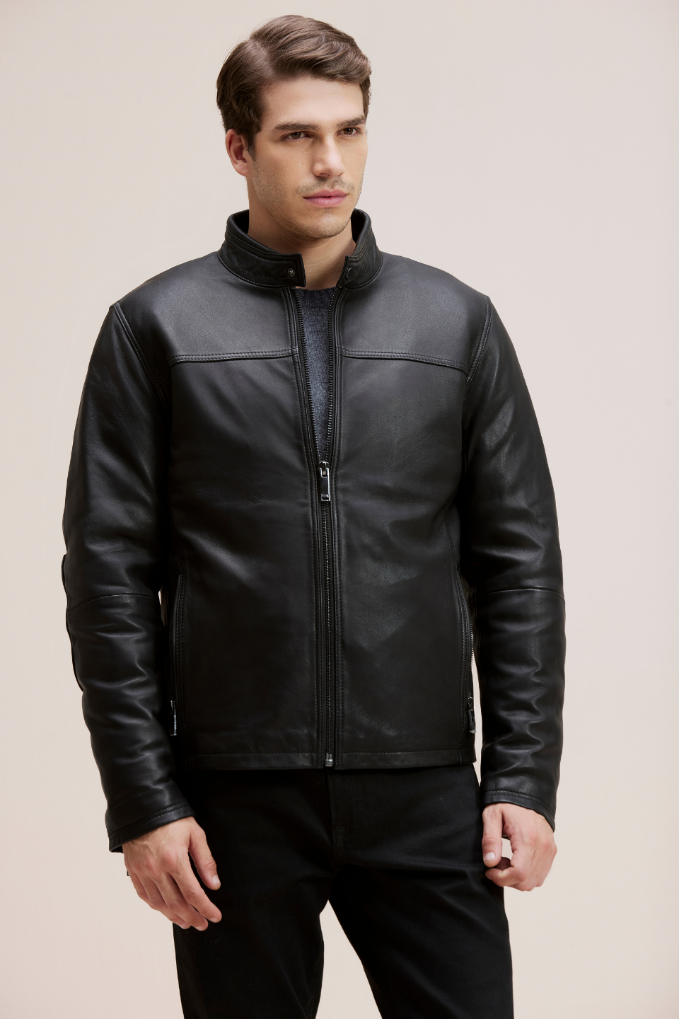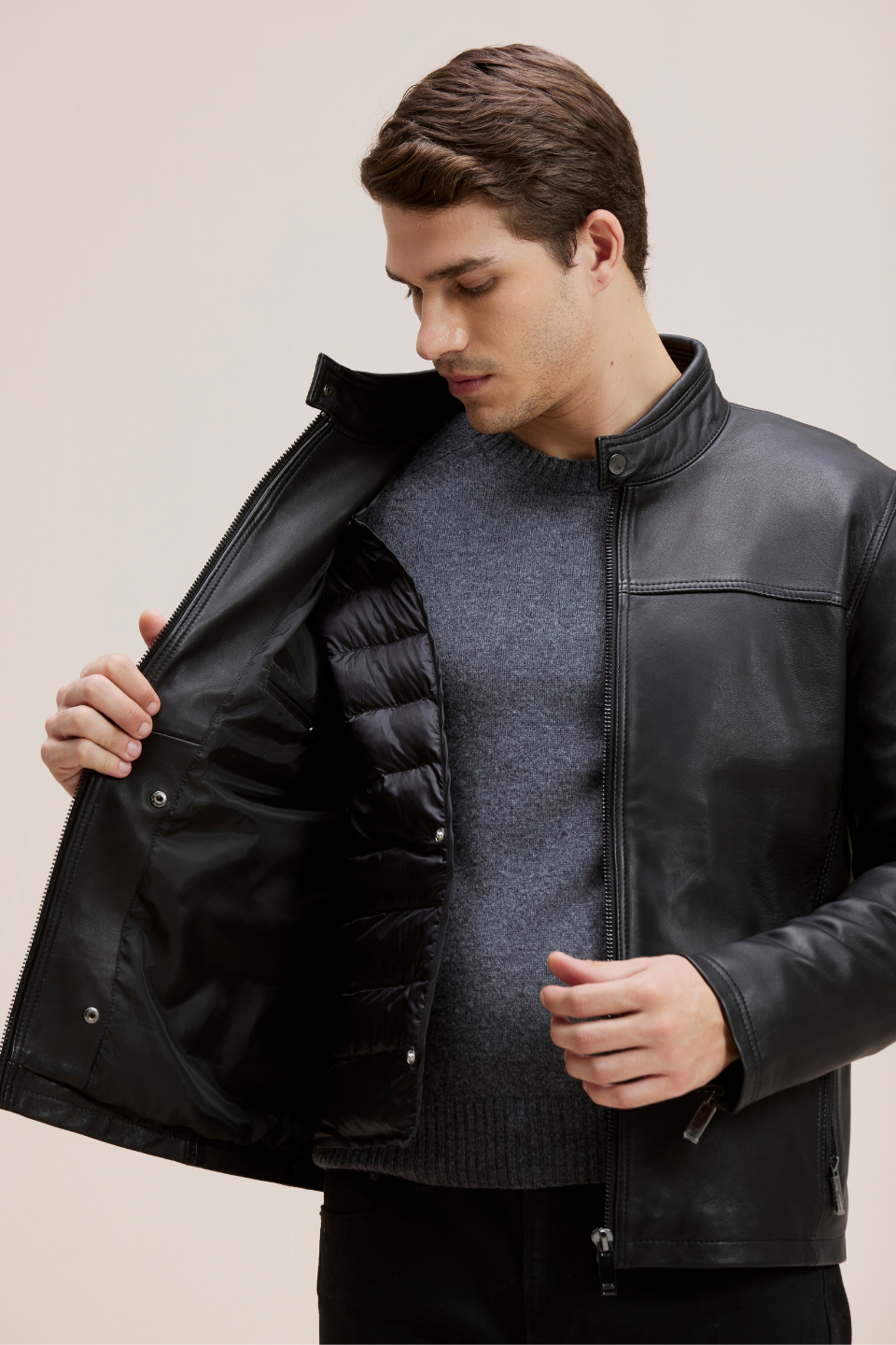 Tackle cooler months in warmth and style with our BOWEN moto style bomber jacket. The design combines our luxurious lamb leather with a detachable lightweight quilted liner. The liner features BIO DOWN interior insulation for added warmth, breathability and resistance against moist or wet conditions. The moto cross silhouette ensures a comfortable fit. Zipped external pockets and 2 interior pockets allow easy access to your cellphone, wallet or other essentials. This is a timeless piece that’ll only improve with age.