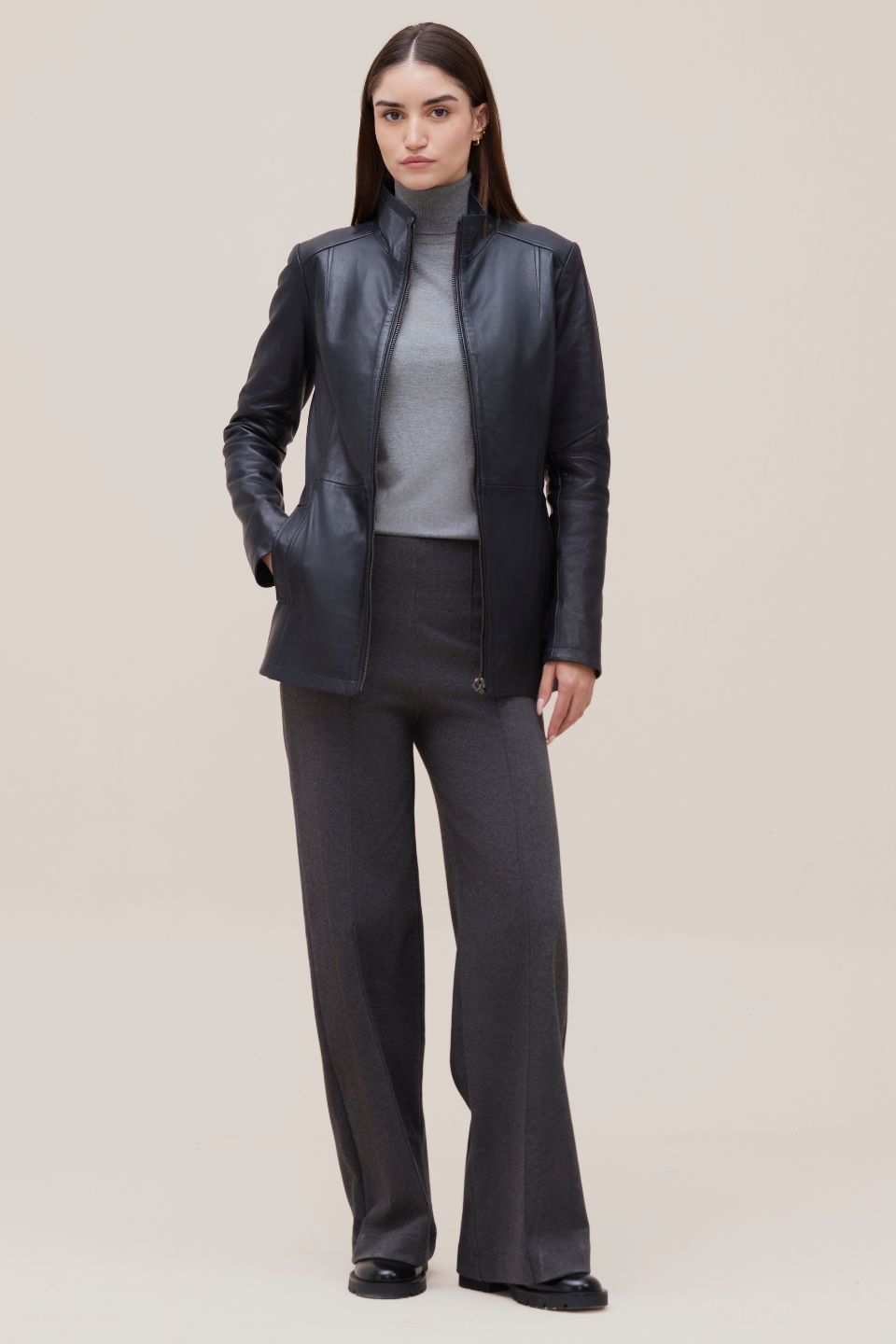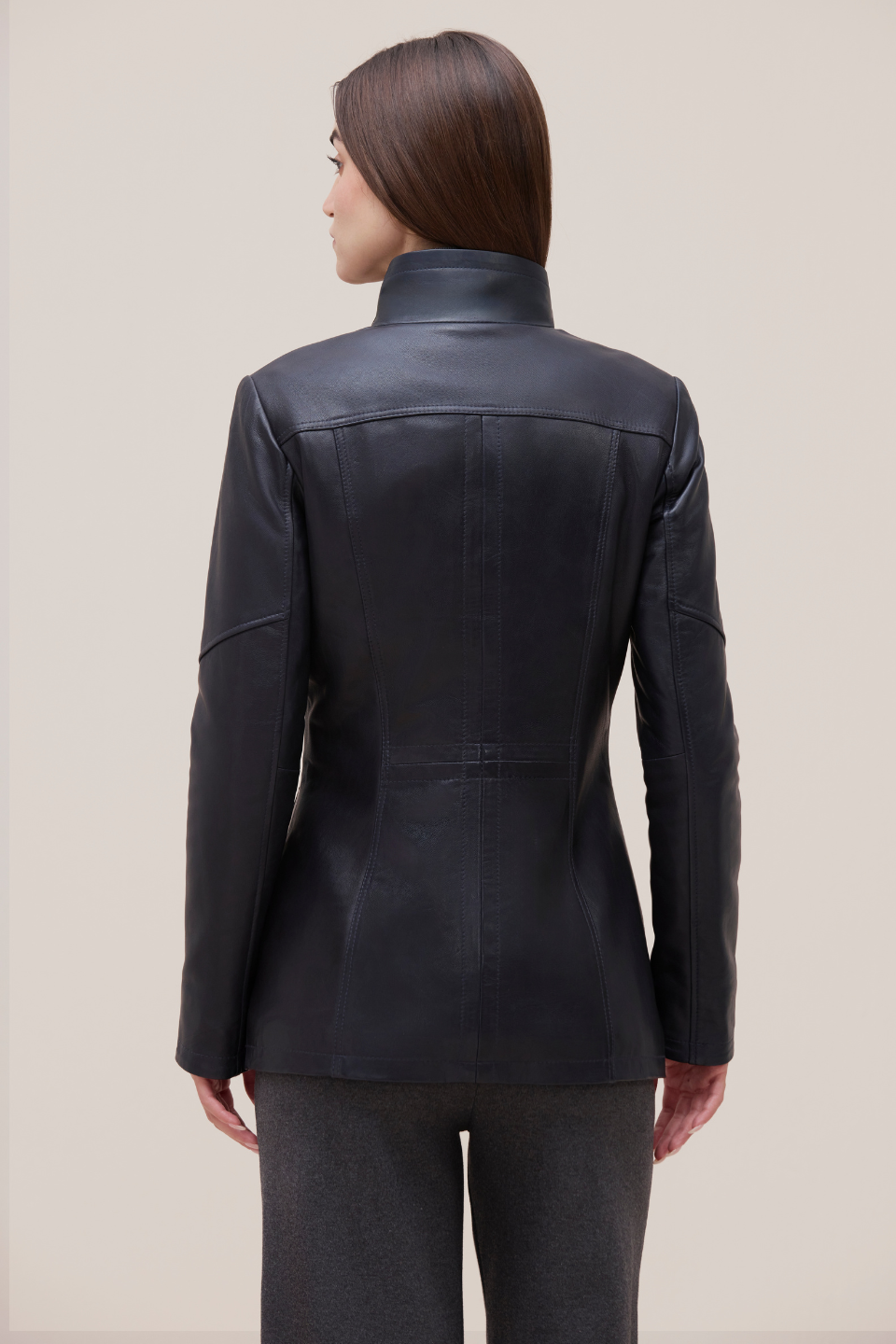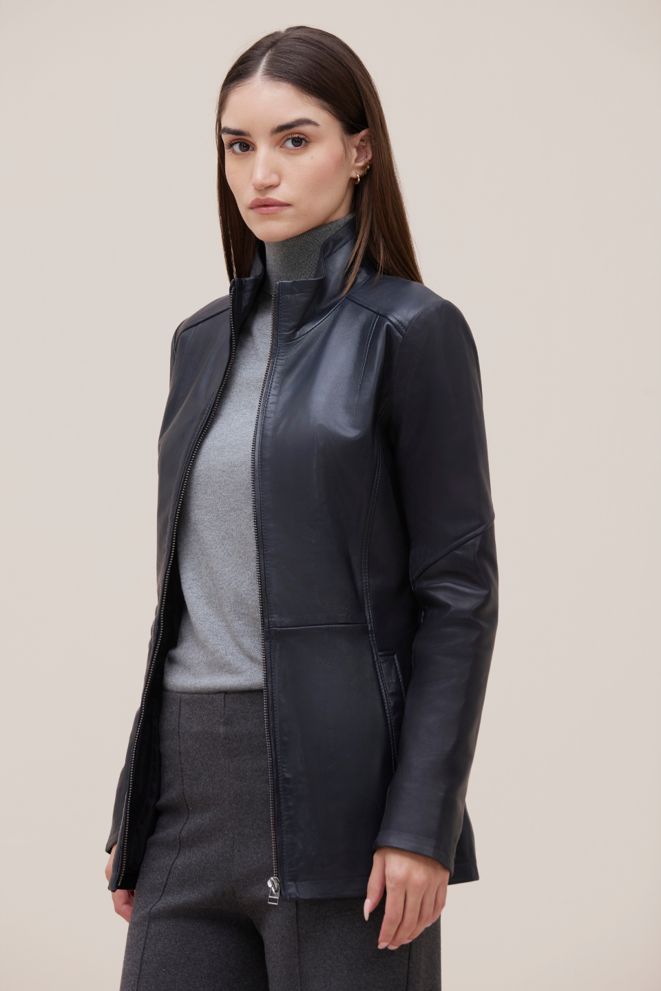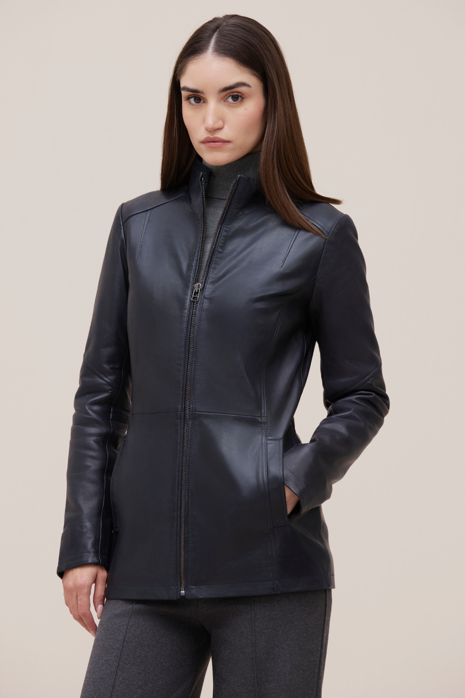 Made of luxuriously soft lamb leather with a funnel neck and tonal zippered details, classic CAROLYN is a perennial favourite.