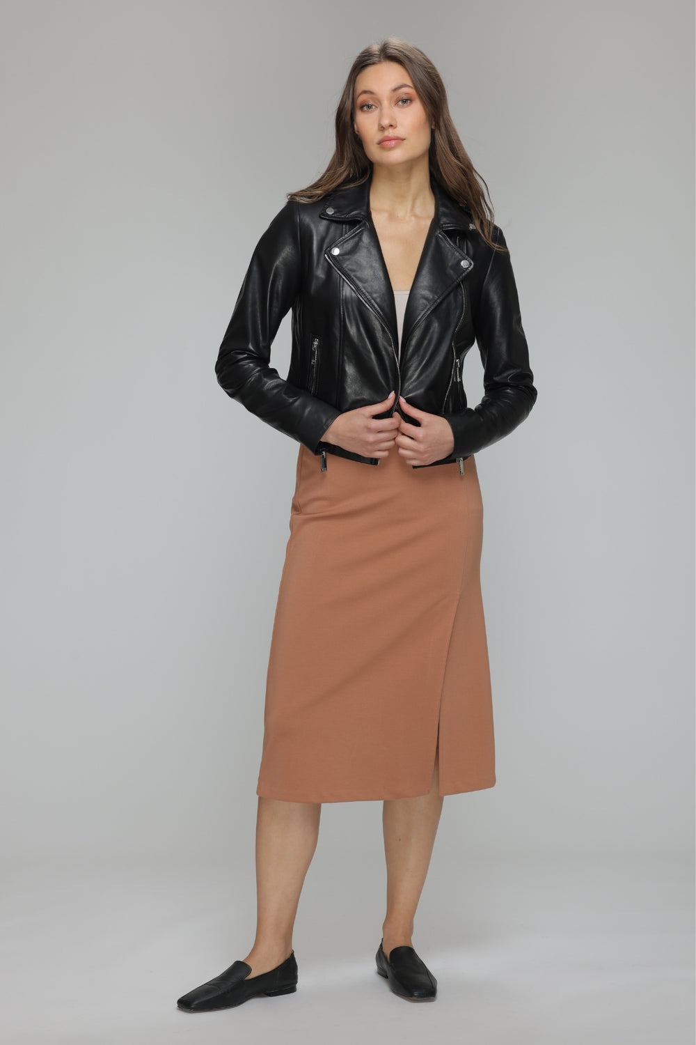 DARIA is a slim, slightly cropped take on the iconic motorcycle jacket. Crafted in a butter-soft drum dyed lamb leather and finished with an asymmetric closure.
