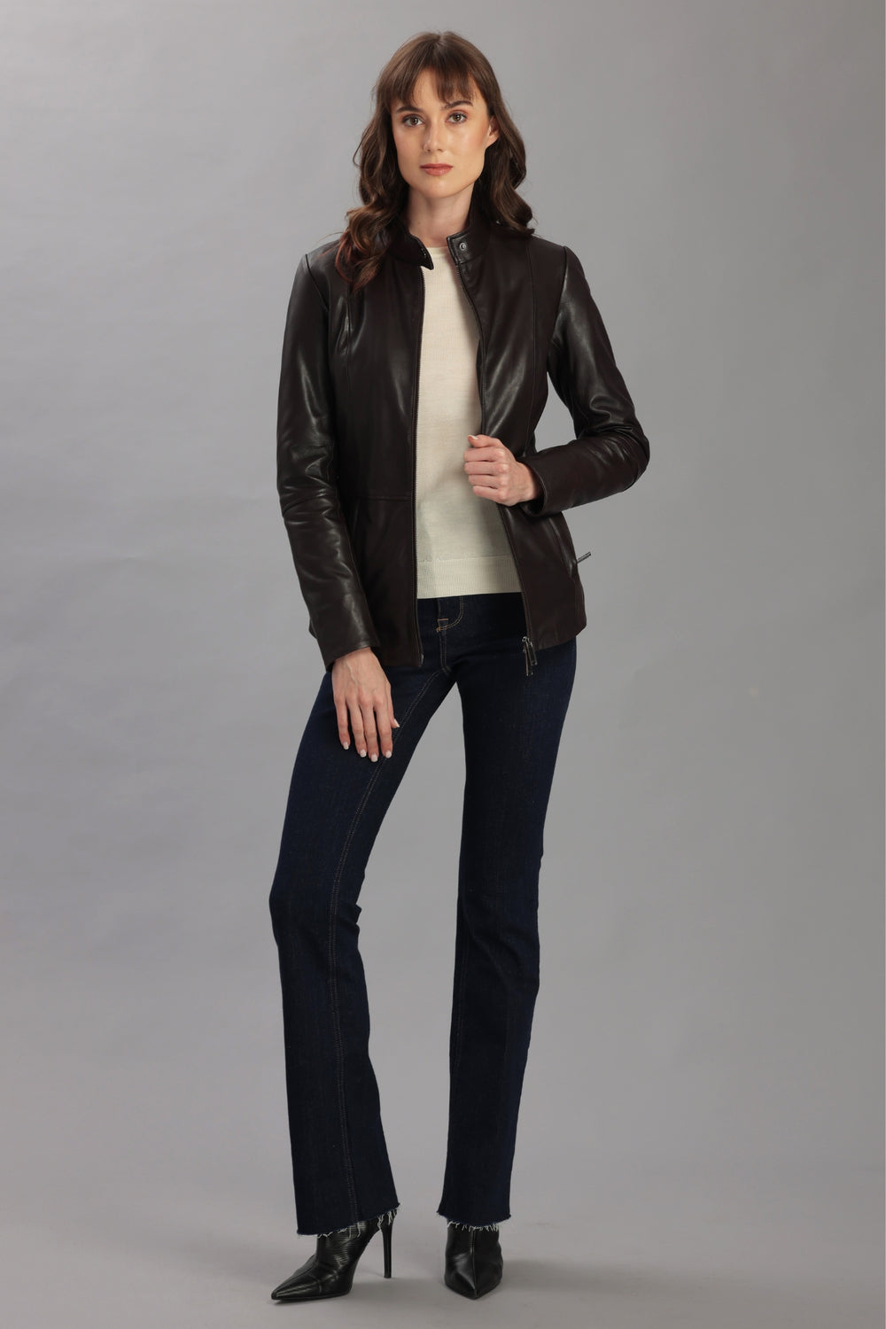 Clean, contemporary lines make our DERI genuine lamb leather jacket this season’s easy go-to jacket for all your wardrobe needs. Crafted from our signature supple lamb leather, the design features a two-way front zipper closure, zippered pockets, banded collar, a slim-fit and seam-work designed to shape and flatter any body type. Slide it on over your favorite jeans or wear it with a pencil skirt and heels for a more polished look.