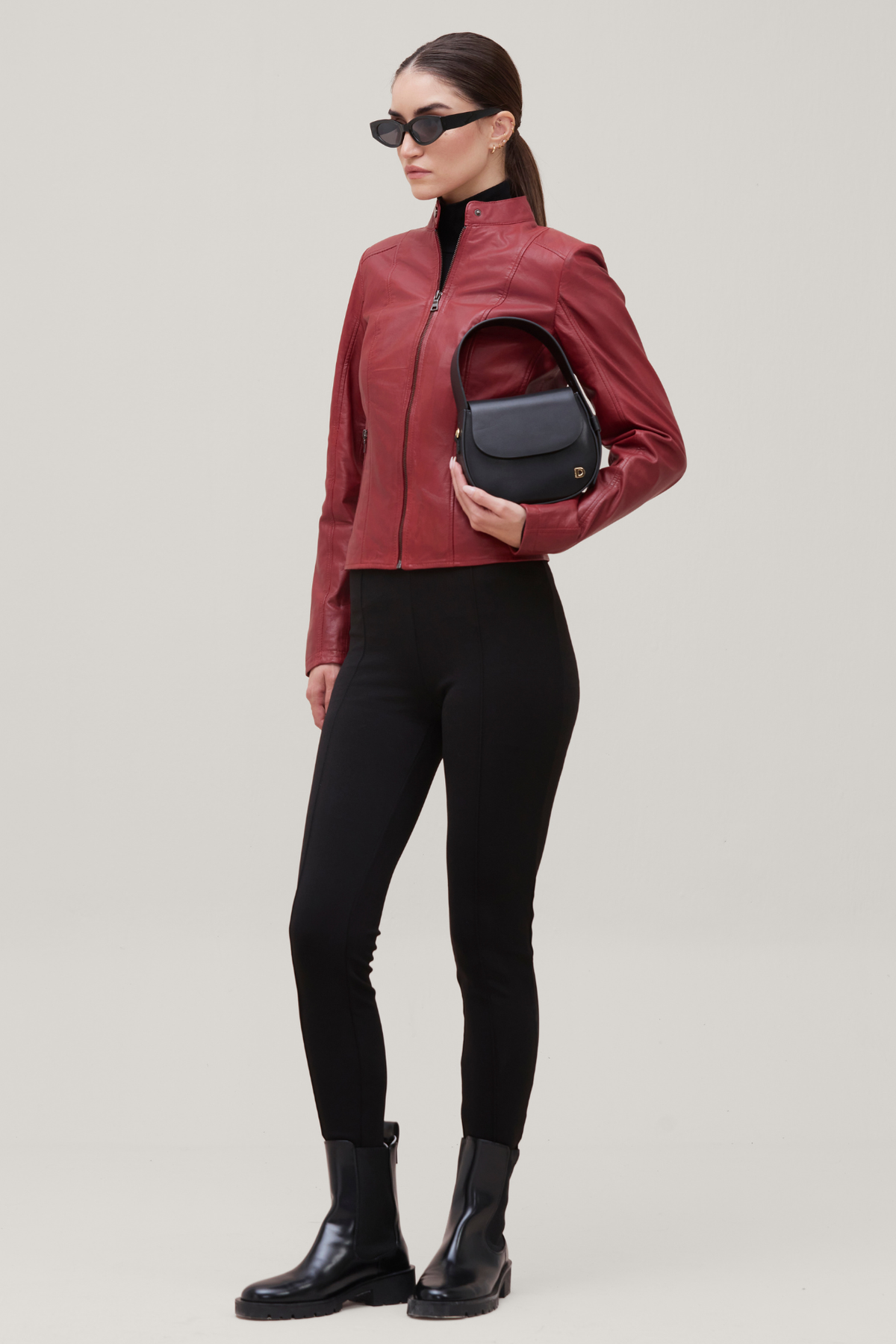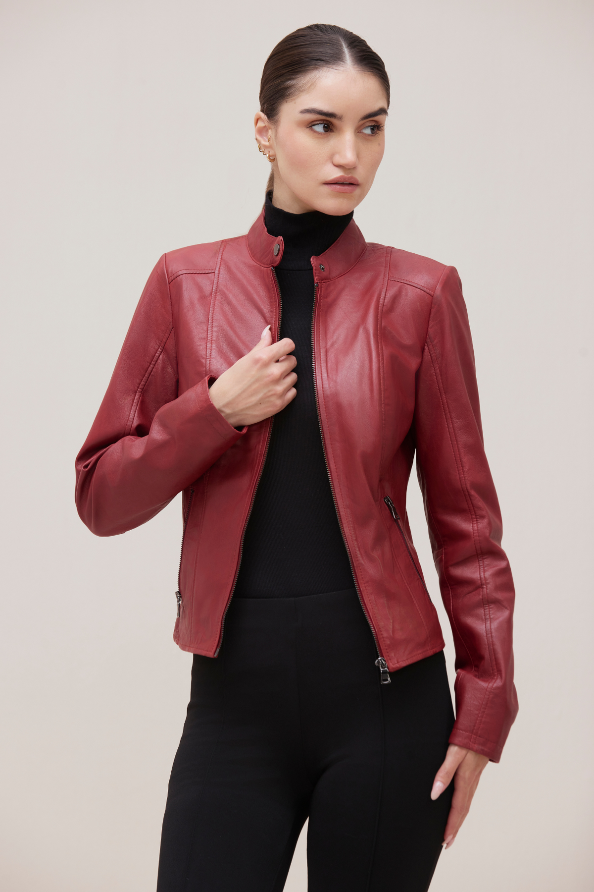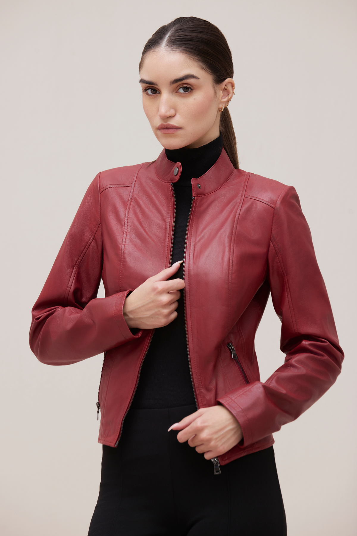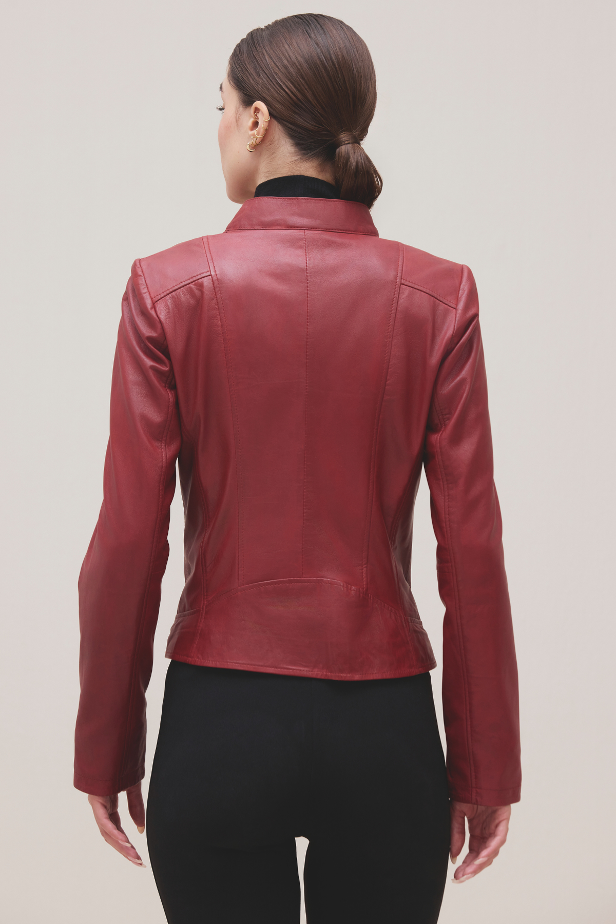 Introducing ISLA: The Modern Moto Jacket. Crafted from premium lamb leather, this sleek design features flattering body-contouring lines, two functional zippered pockets, zippered cuffs, and a sporty snap-front collar. Fully lined for added comfort and style, the ISLA jacket is your go-to piece for an effortlessly edgy look.
