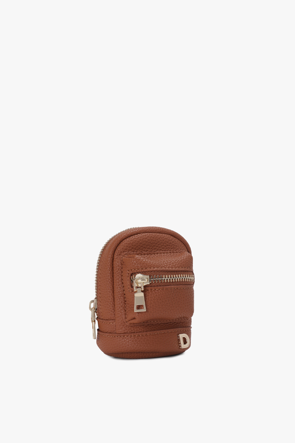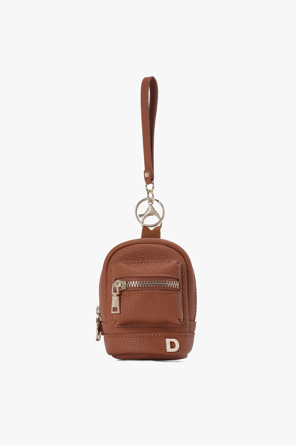 • Exterior: Zippered pocket, key-chain hardware, miniature shoulder straps