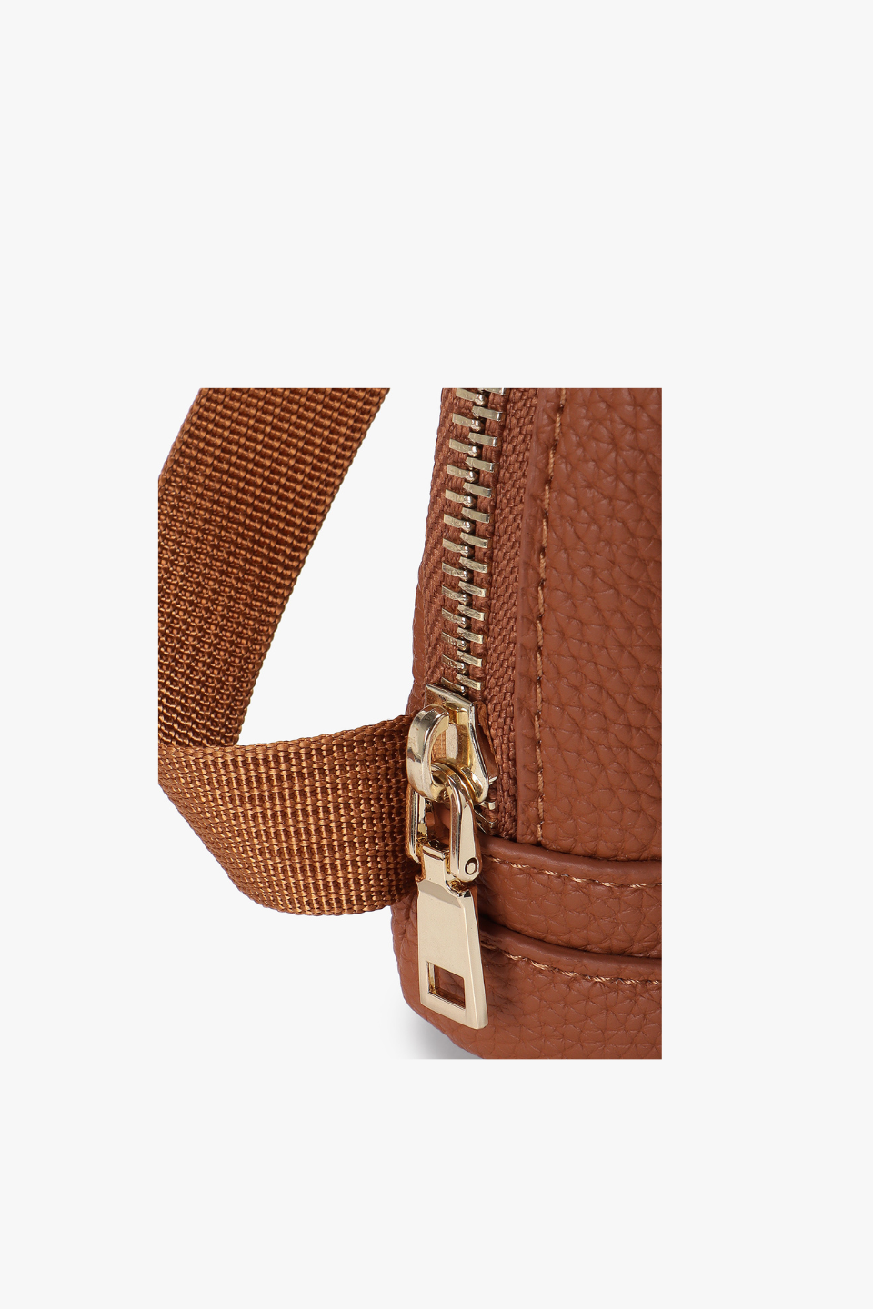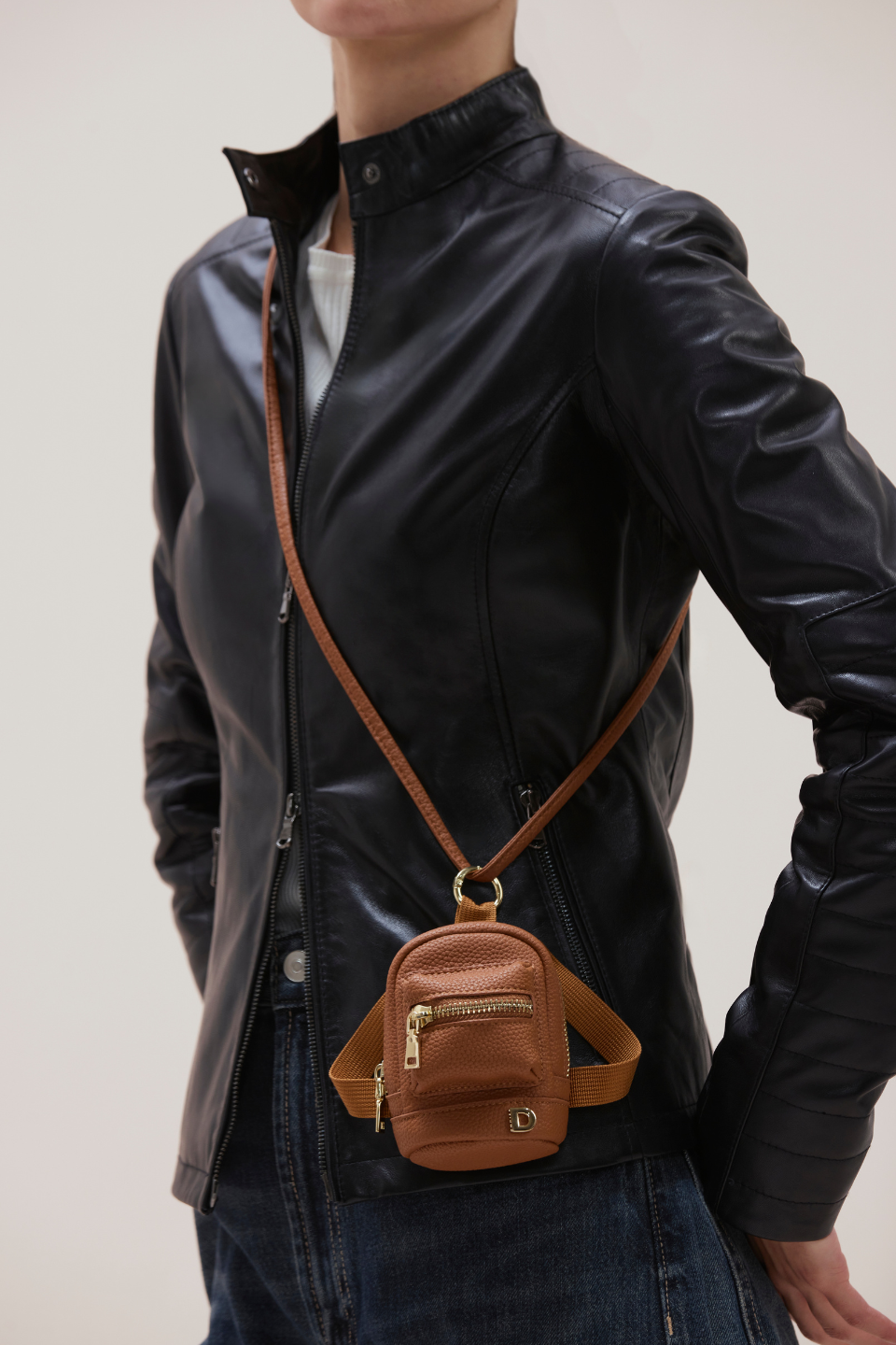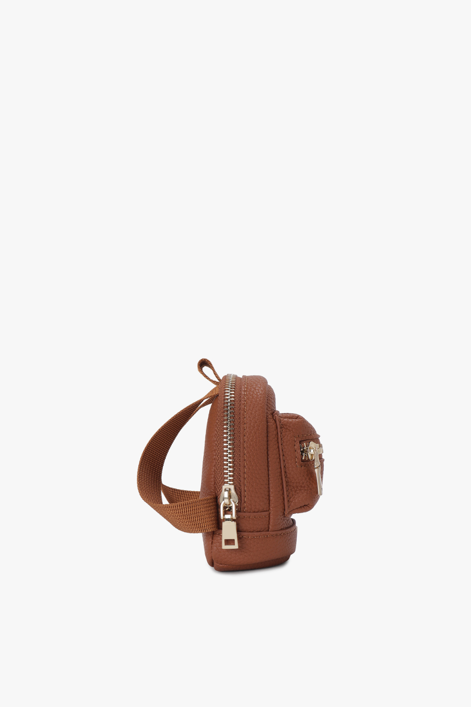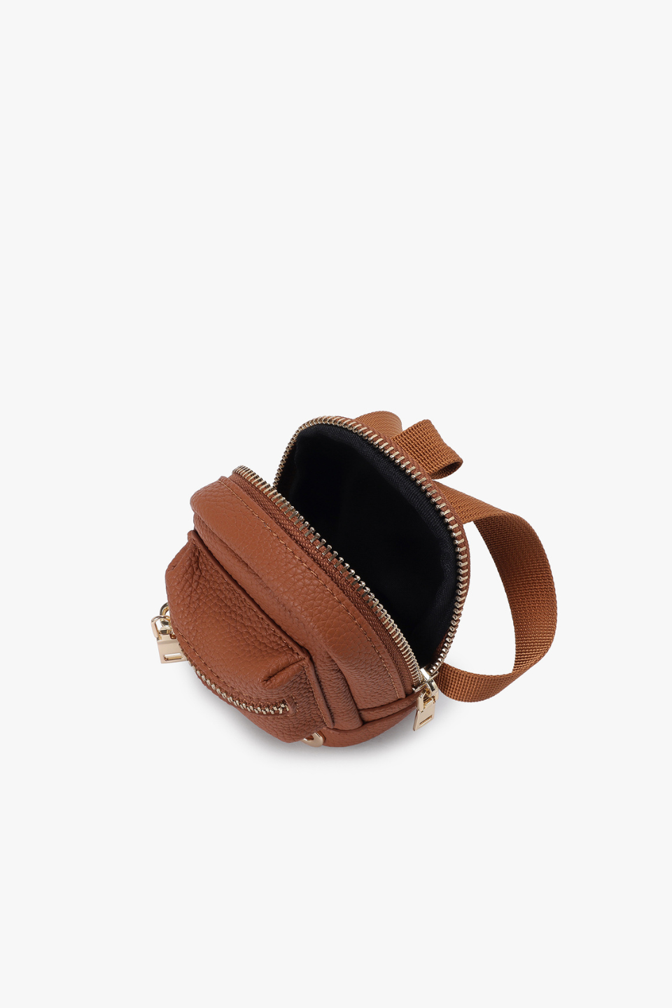 Playful, compact, and crafted in genuine pebble cowhide, the JIMENA MINIATURE brings a stylish twist to everyday tech essentials. Designed as a mini backpack, it features shiny gold hardware, a zippered front pocket, and miniature shoulder straps for a charming, elevated look.