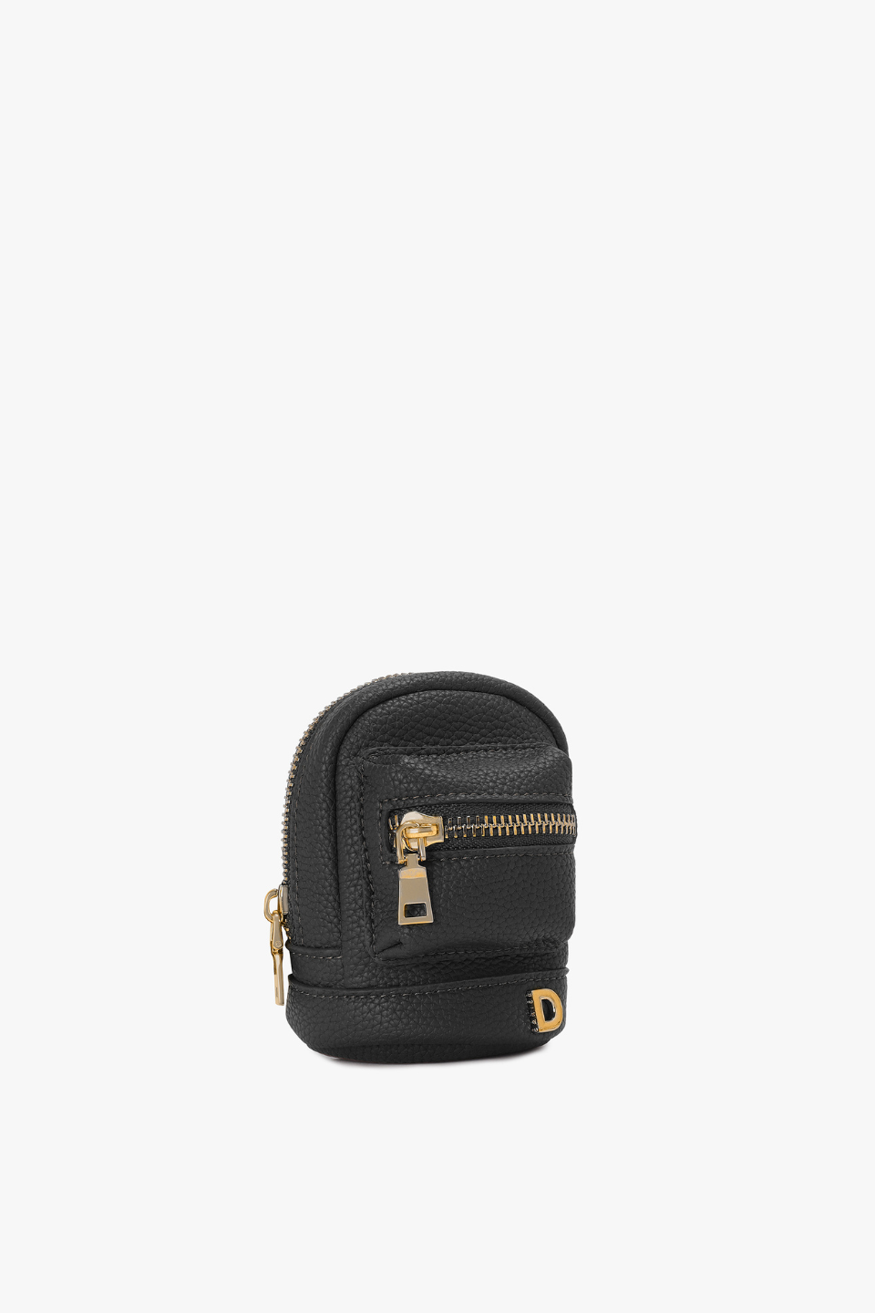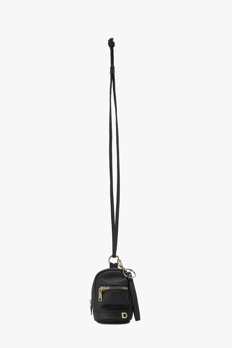 - Exterior: Zippered pocket, key-chain hardware, miniature shoulder straps