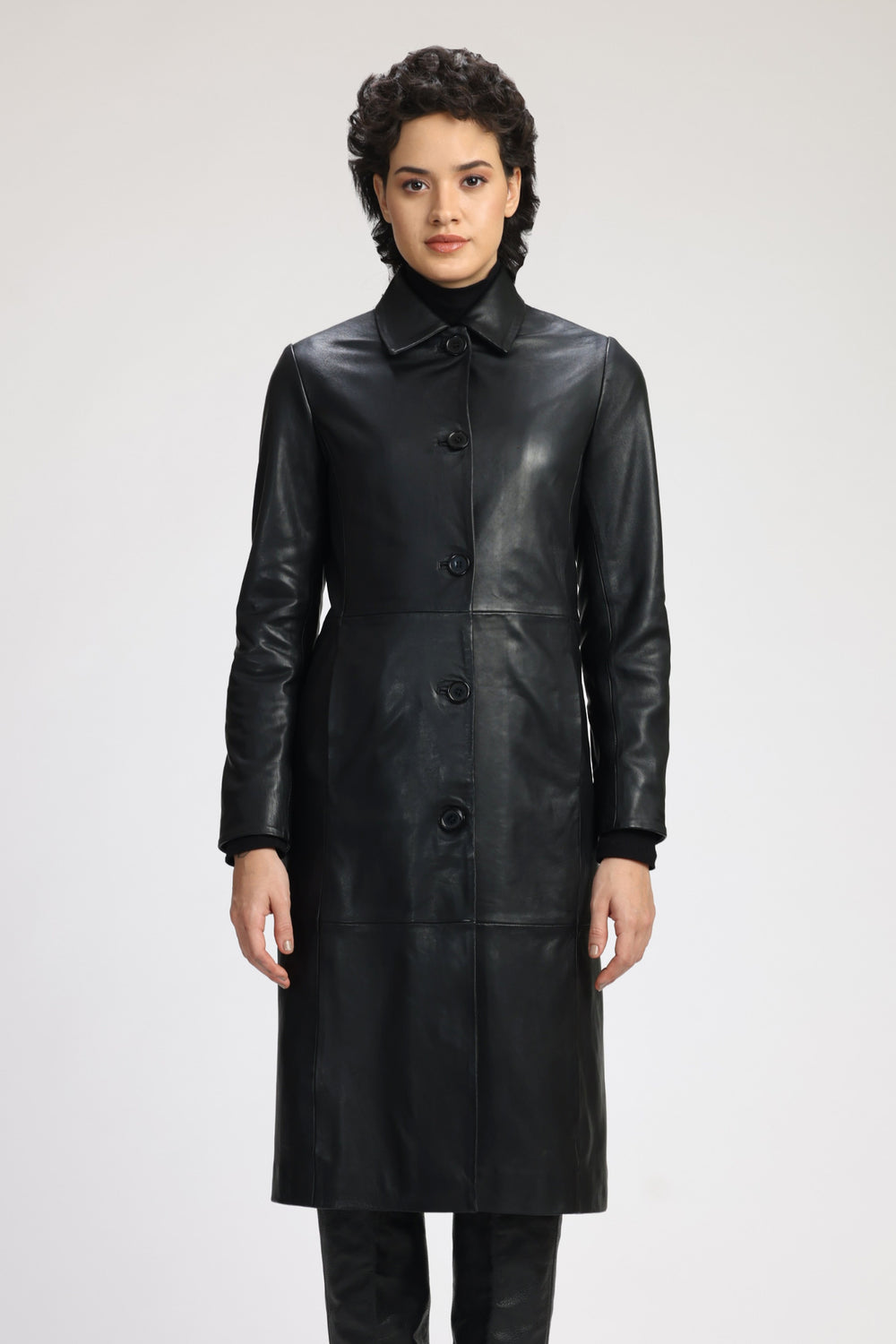 Introducing KEDDA, our minimalistic and modern coat. Cut from our signature genuine Lamb Leather and fully lined in our jacquard logo lining, it features a tailored shoulder, an attached back belt, and a single-breasted button front opening. The versatile just-below-the-knee length makes it a perfect layering piece for dresses, skirts, and pants. This coat will be worn and enjoyed for many years and with many outfits!