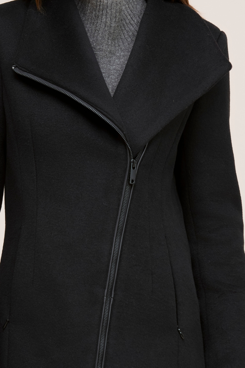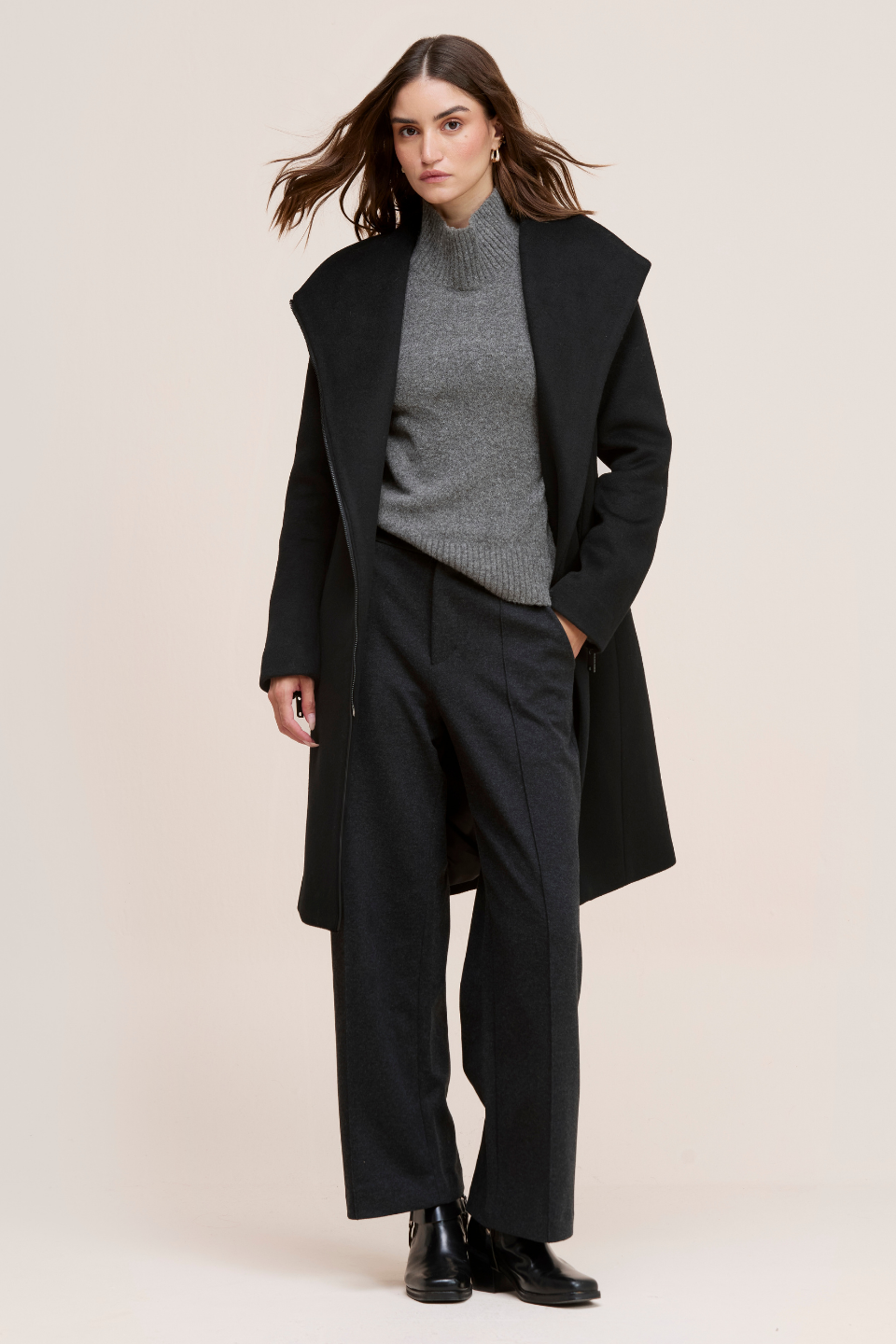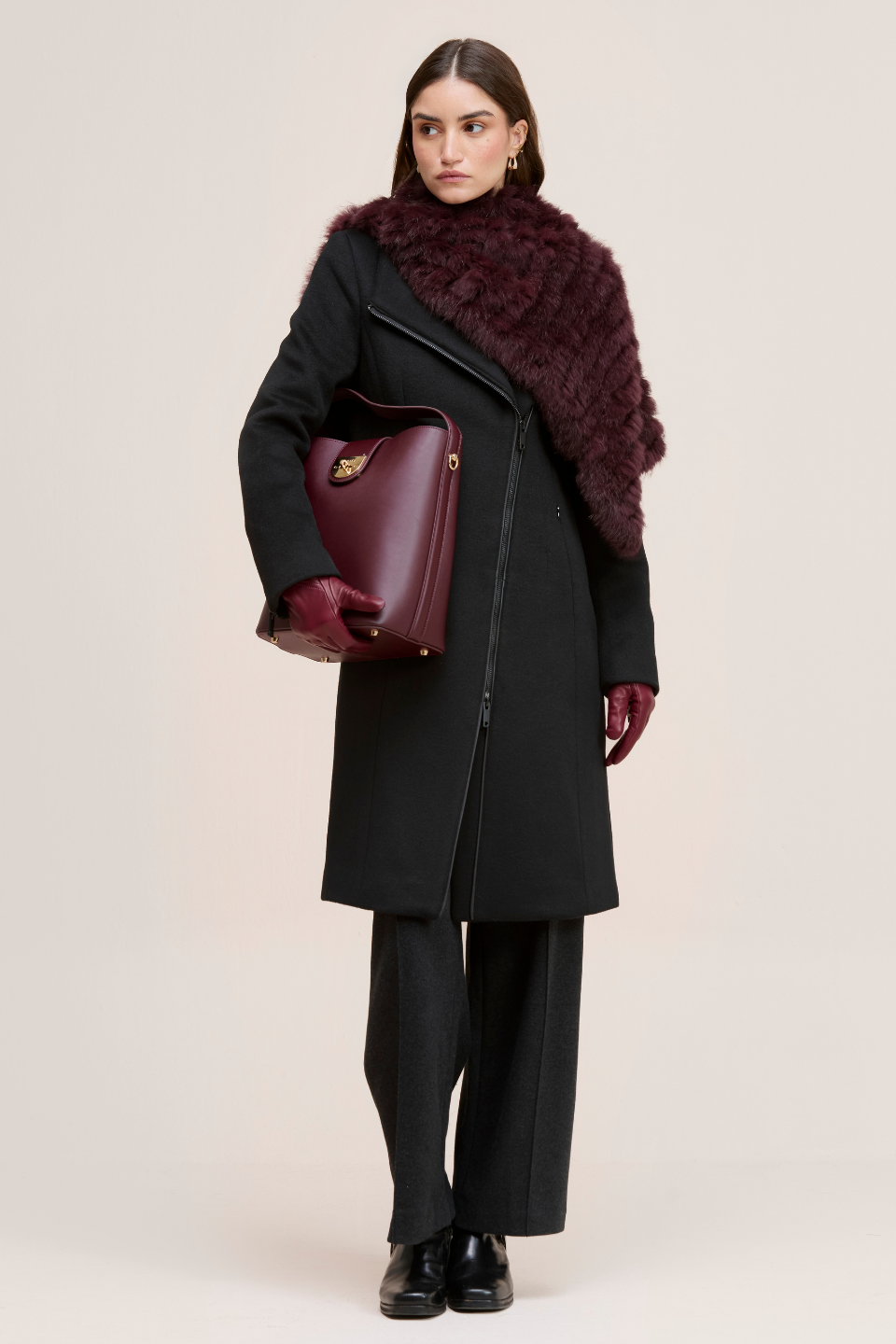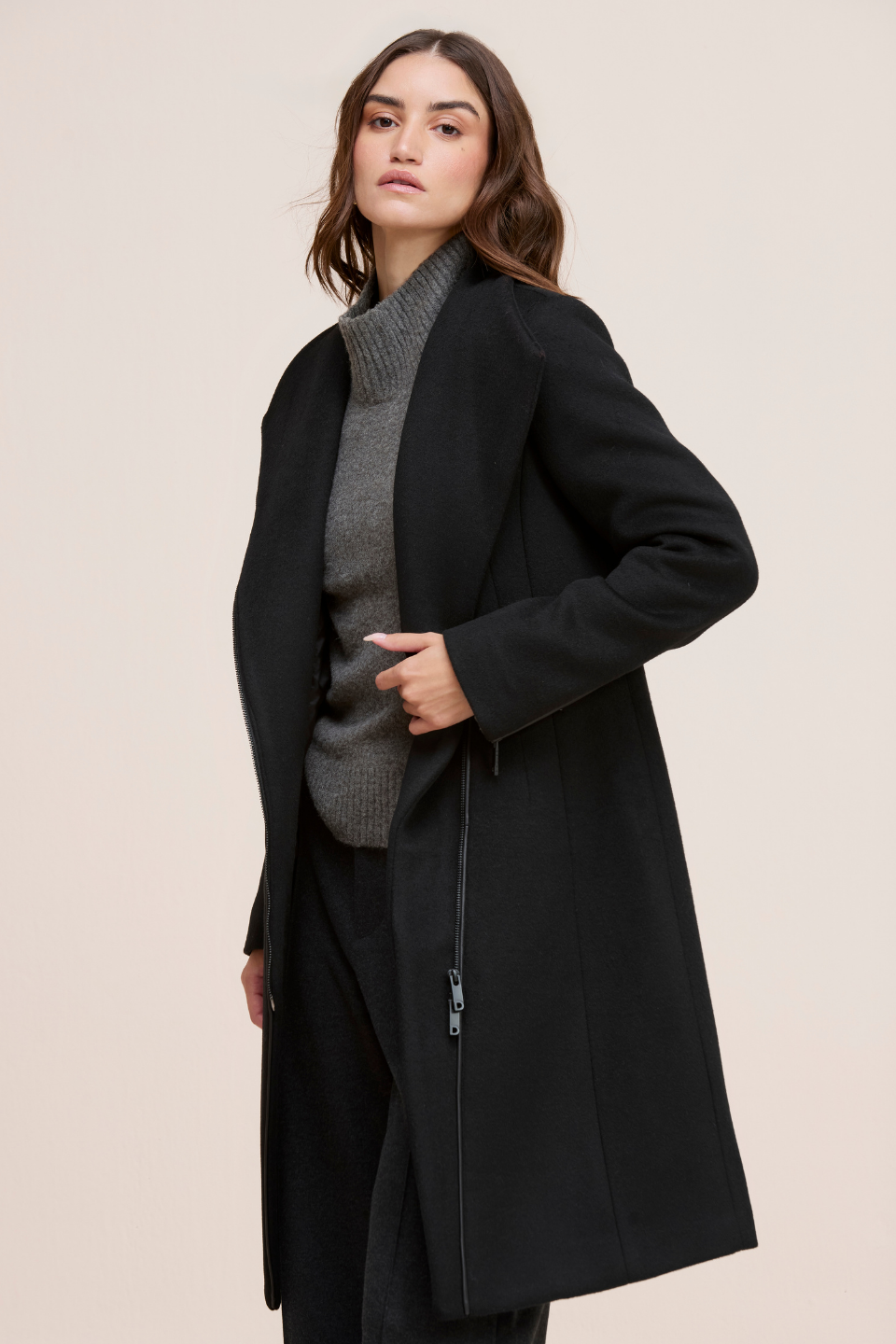 MAZIE is a modern interpretation of the classic wool coat, with an asymmetrical cut and unexpected leather trims. Designed in a slim fit with matte black hardware and a double zipper, it brings sharp structure to cooler days. A discreet zip pocket keeps your essentials close while letting the silhouette do the talking.