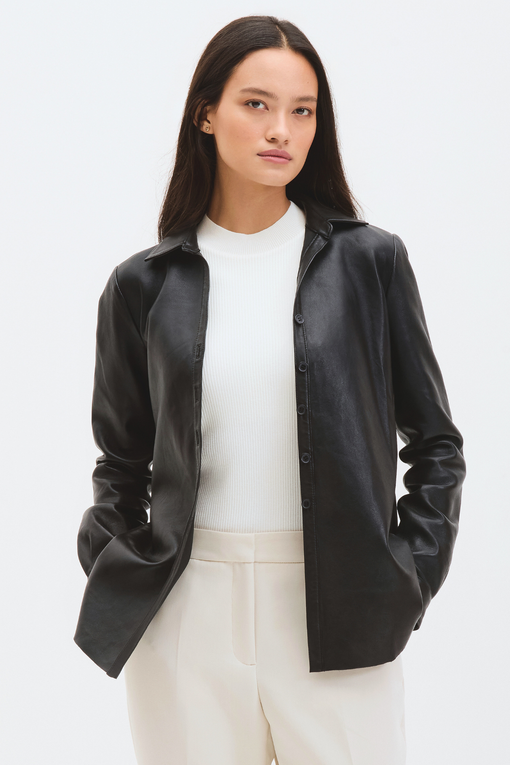 NOLLA turns the classic dress shirt into a lightweight lamb leather piece. The button front closure keeps the look familiar, while the supple texture makes it unmistakably modern. Perfect on its own or layered for transitional dressing.