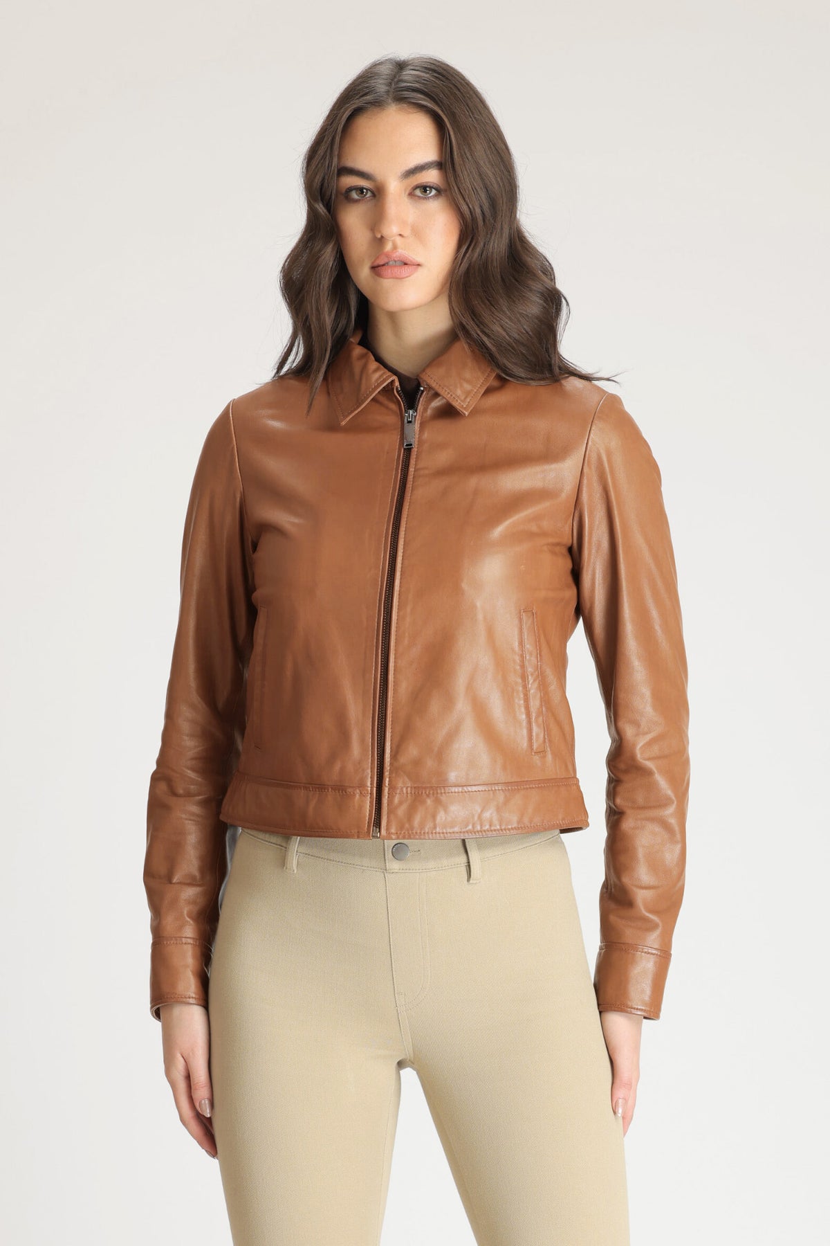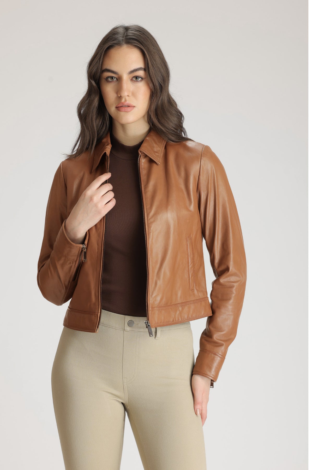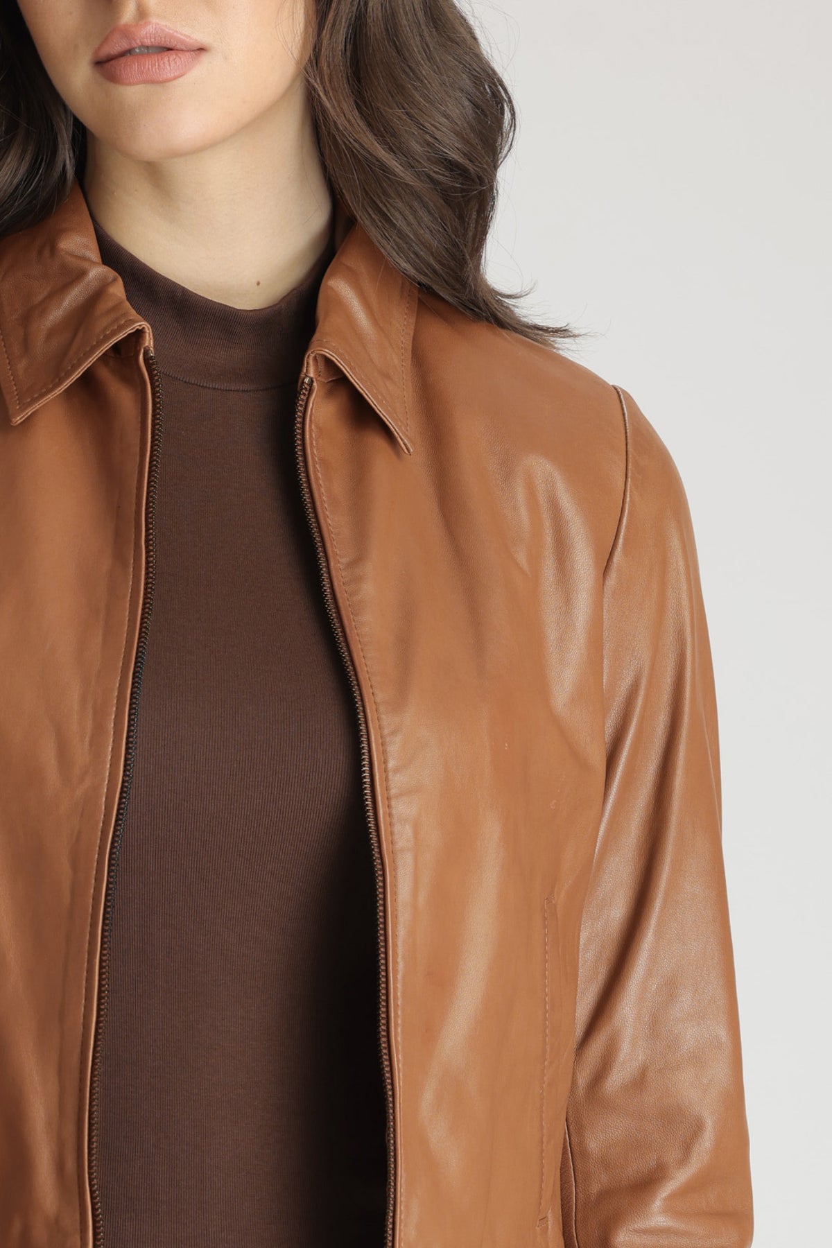 A fine example of the commanding luxury for which Danier is renowned. TILLY, a classic shirt collar zip front jacket has been crafted in our iconic genuine lamb leather. Wear yours with all manner of casual look, or dress up with a turtleneck, long slim skirt and boots for an evening out.