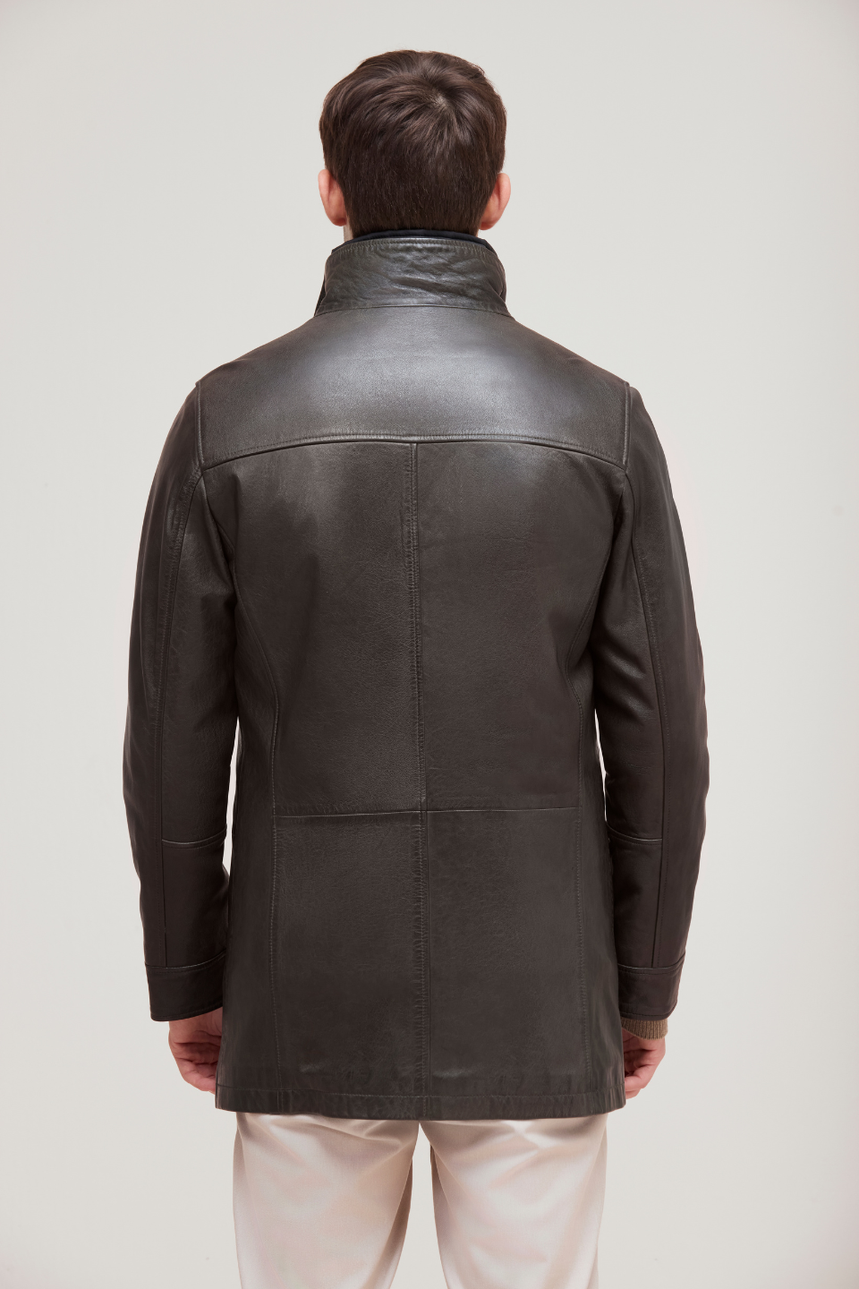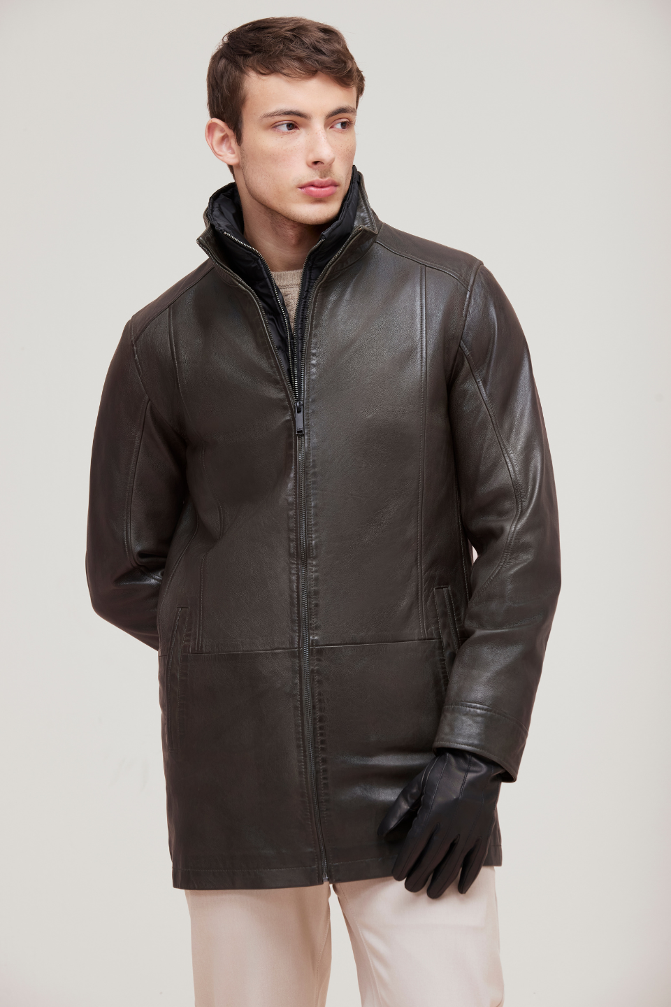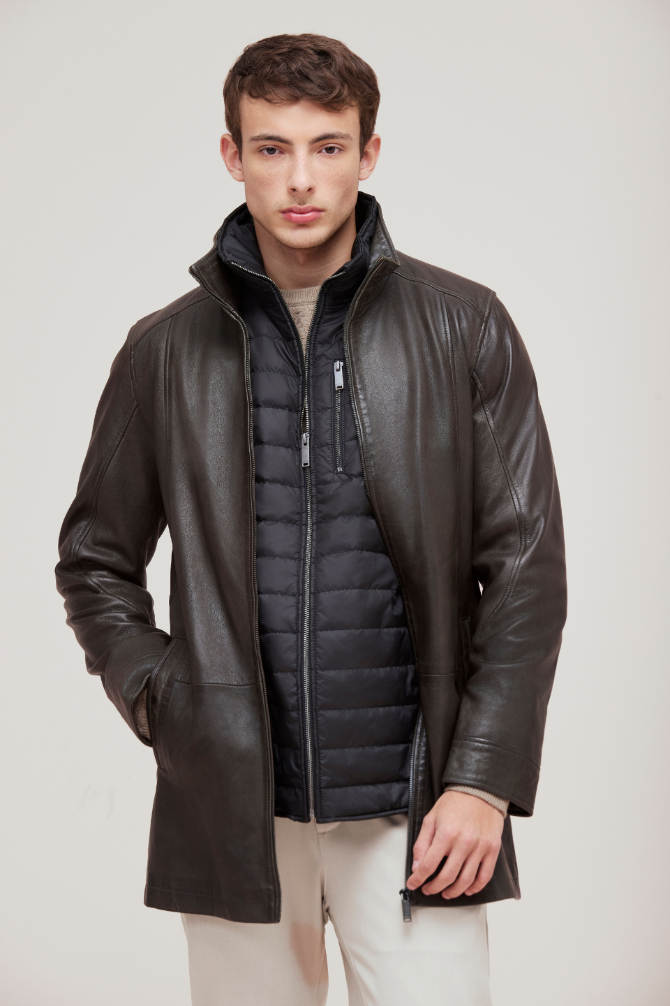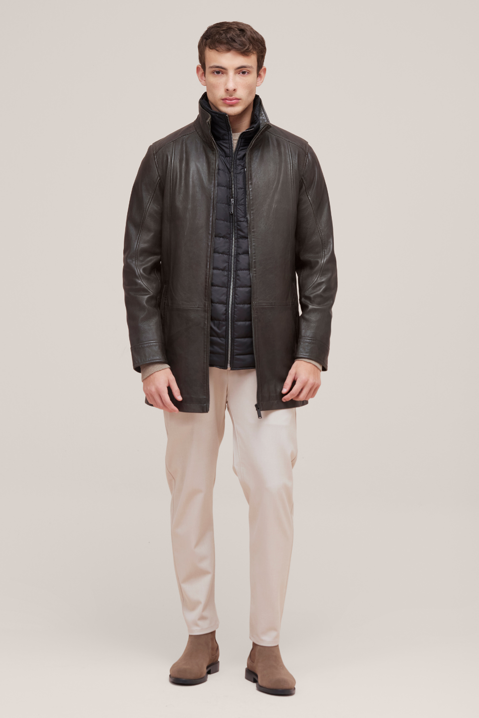 ZANDER. Genuine lamb leather jacket includes details like three interior chest pockets, one with a zipper closure to keep your valuables safe, and a detachable quilted vest that can be worn on its own.